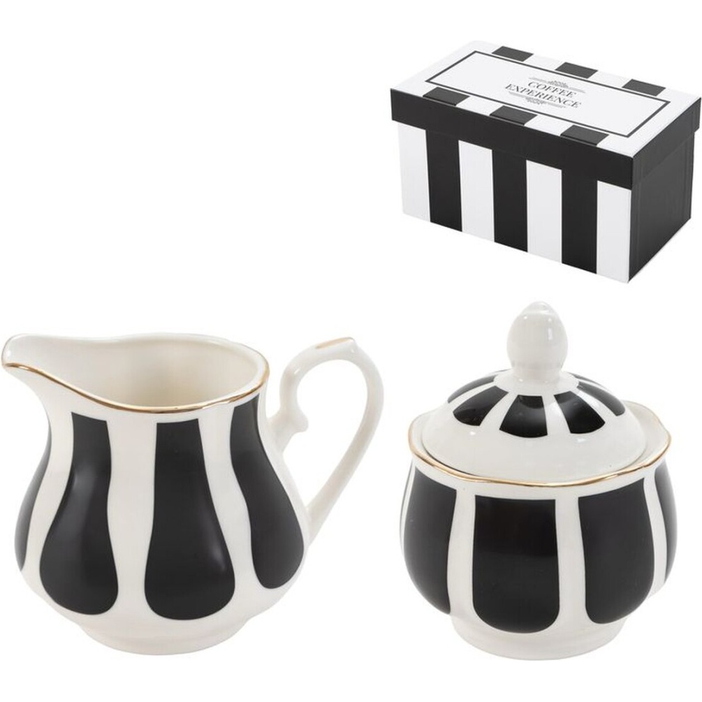 Conjunto de mesa elegante que combina o contraste preto e branco com um delicado detalhe dourado, adicionando um toque sofisticado. O design em listras traz personalidade e estilo a qualquer serviço de chá ou café.