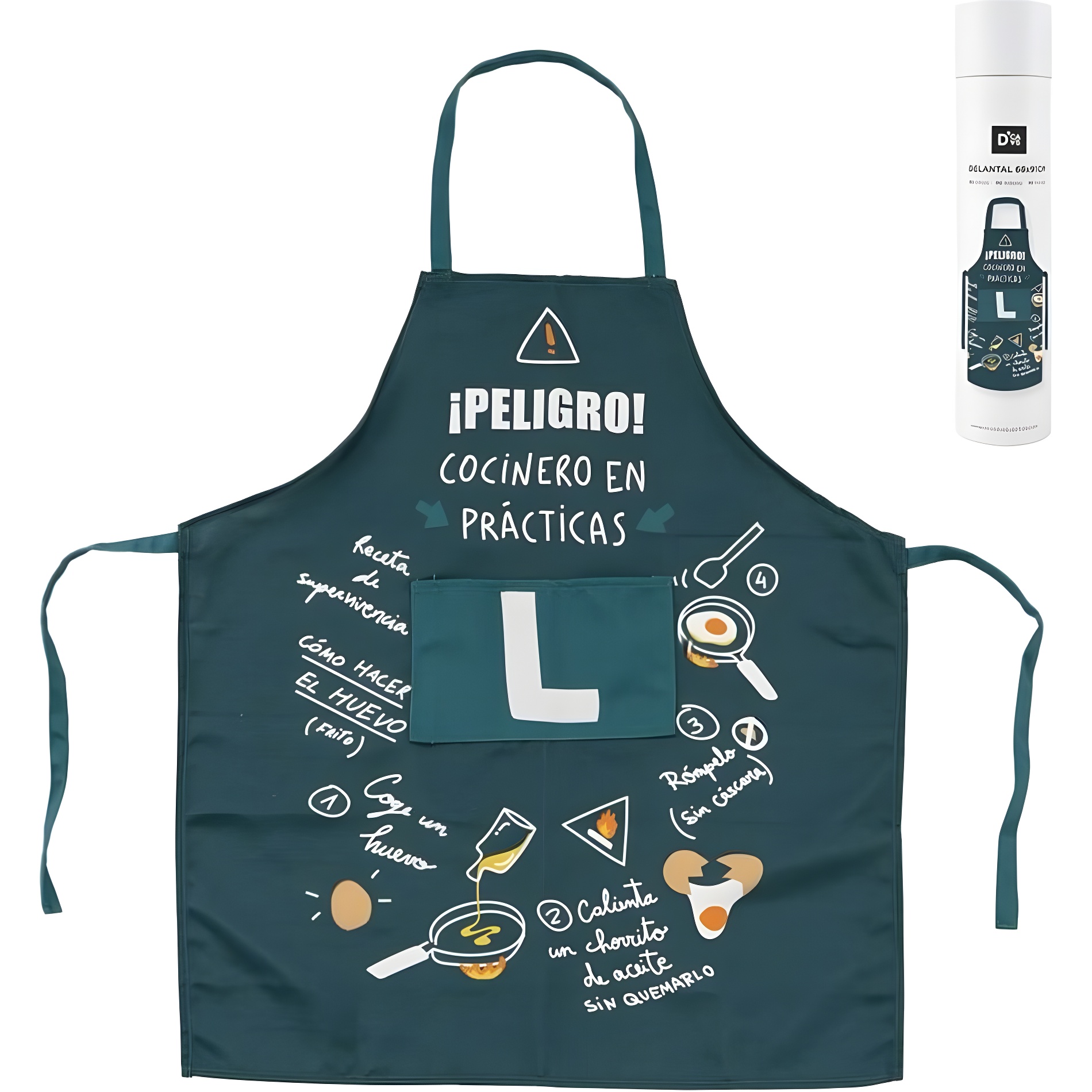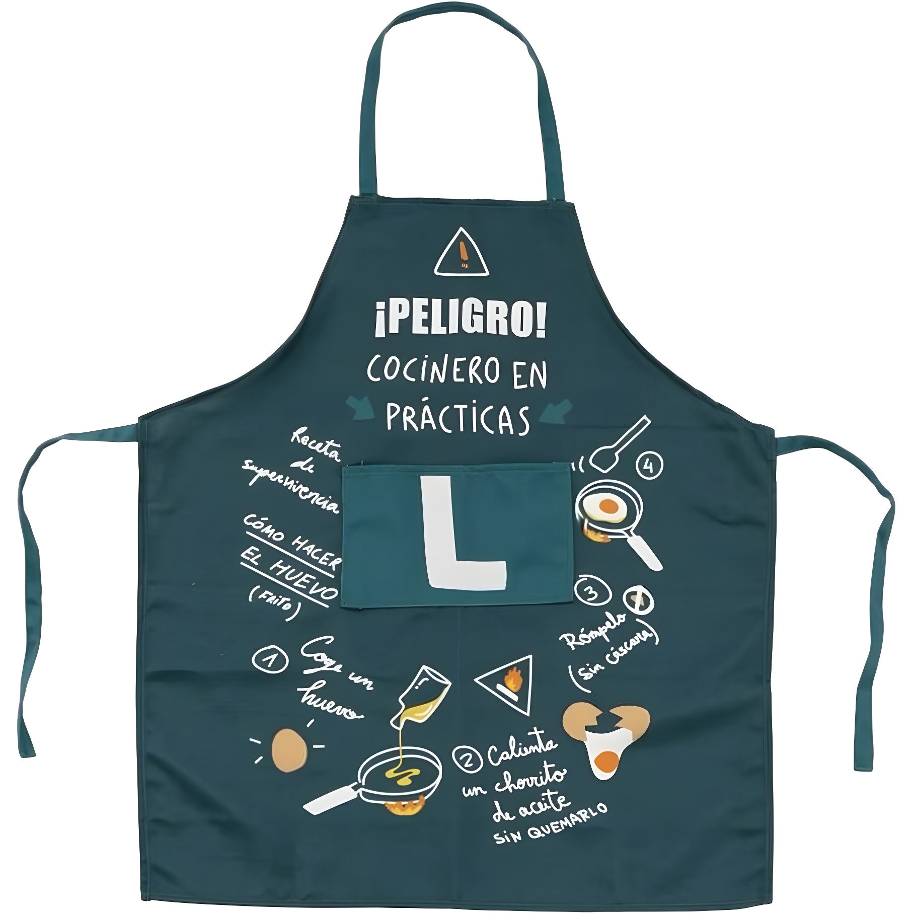Divertido avental infantil com a mensagem "¡Peligro! Cocinero en prácticas", concebido para despertar a imaginação e o gosto pela cozinha desde cedo.
