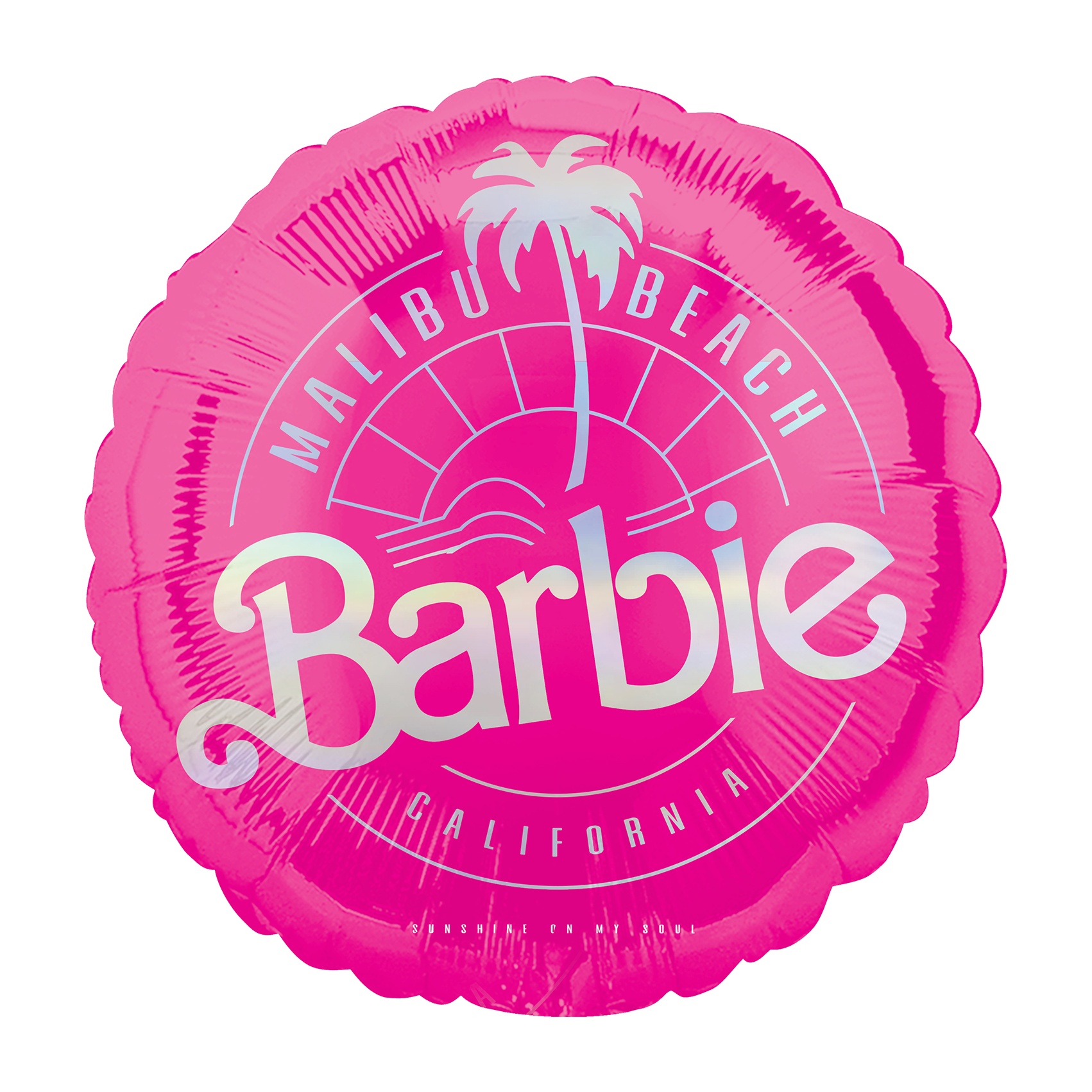 Balão metálico redondo com o icônico logotipo Barbie Malibu em rosa intenso.
