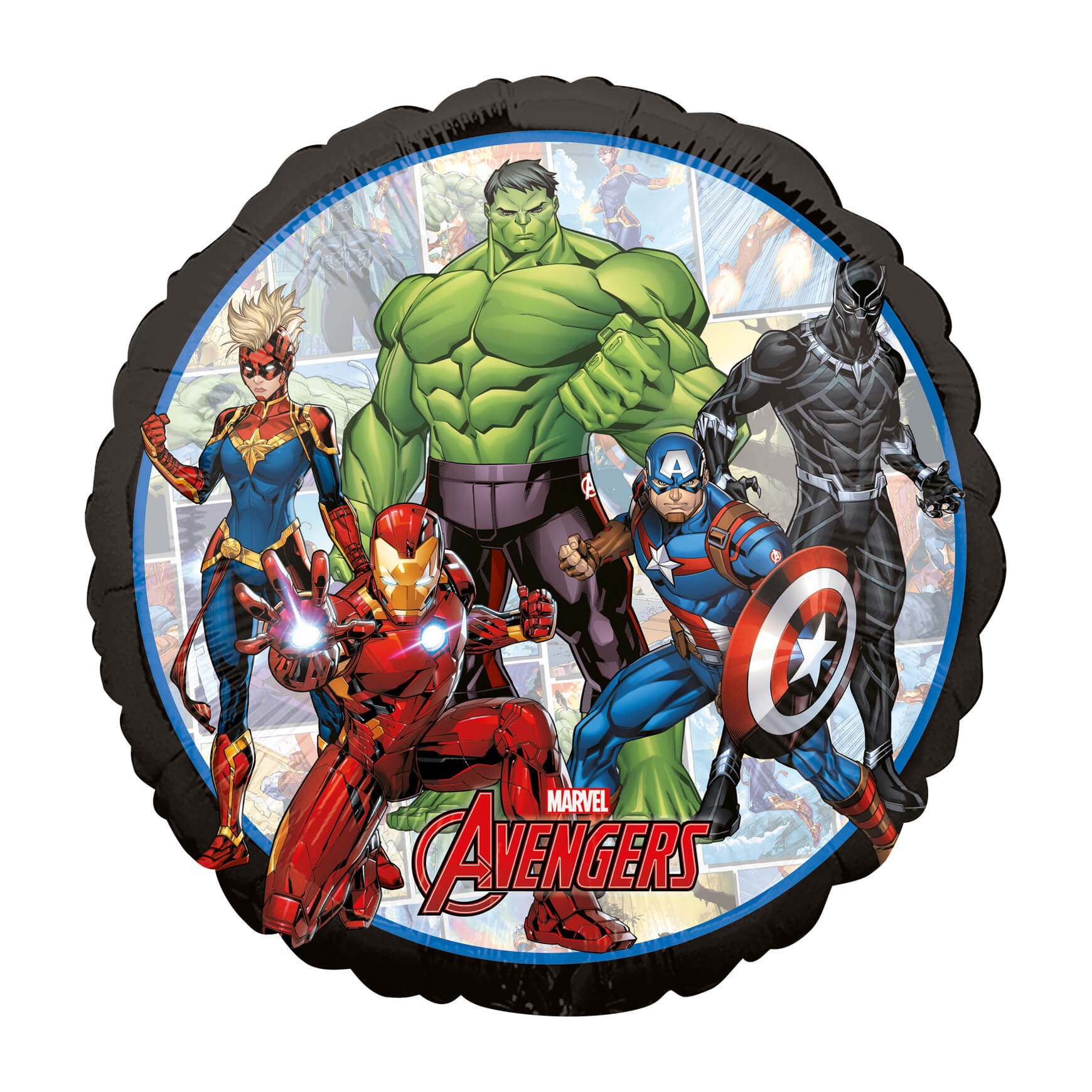 Balão foil oficial dos Vingadores com design colorido que inclui Hulk, Homem de Ferro e Capitão América.