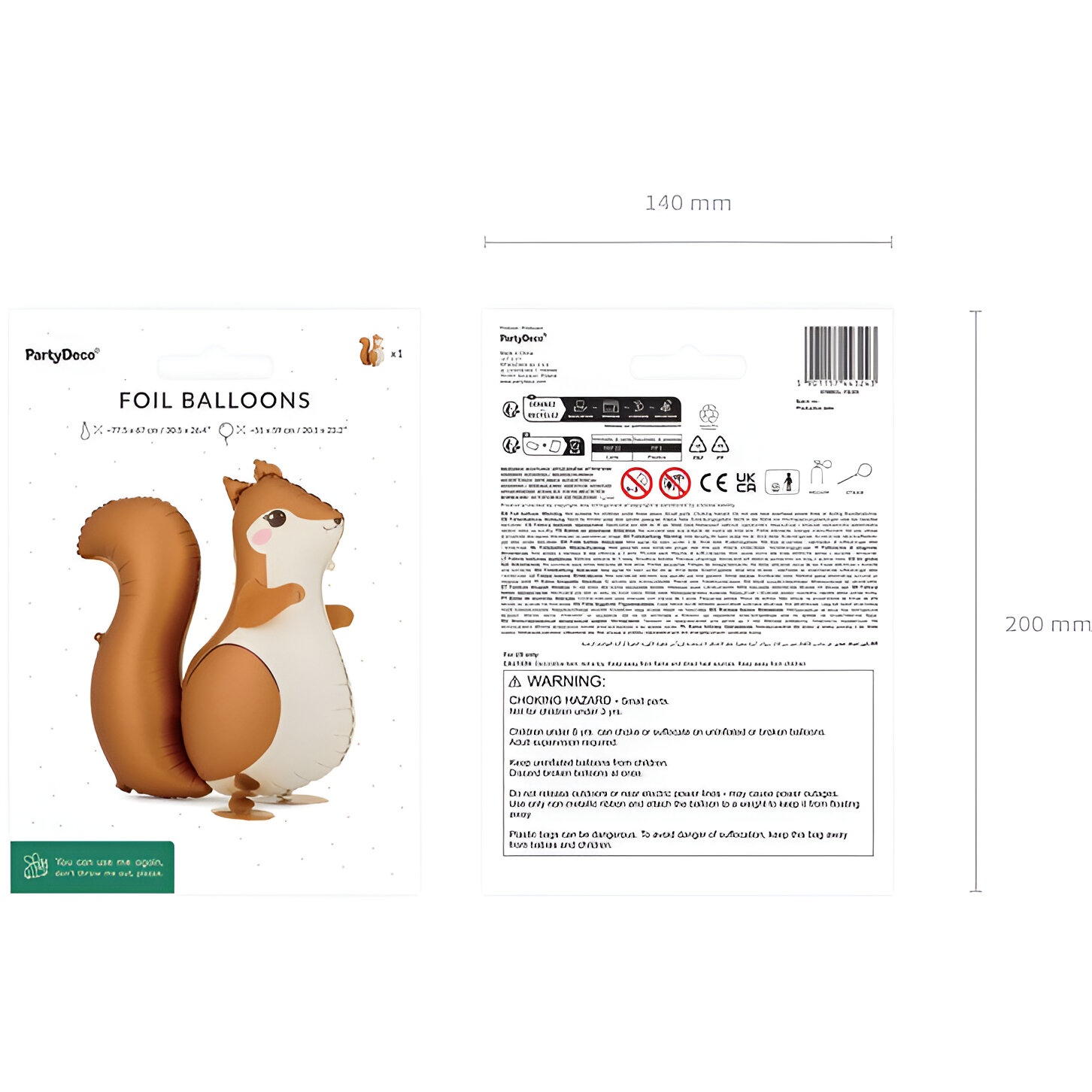 Balão metalizado em forma de esquilo em posição de caminhada, em tons laranja e creme, com acabamento brilhante e silhueta tridimensional que confere movimento e ternura a qualquer decoração infantil.