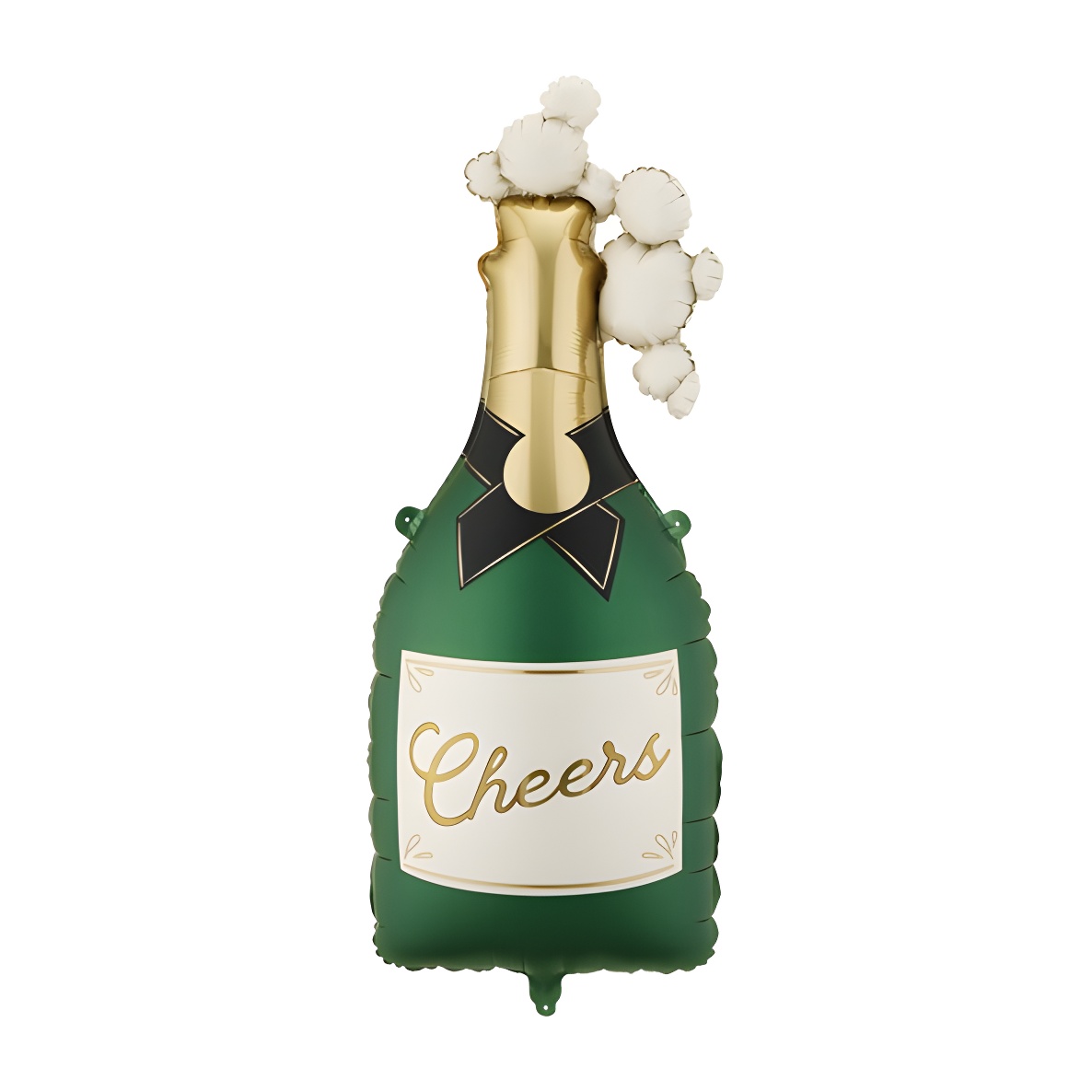 Balão foil com formato realista de garrafa de champanhe em verde-escuro e a inscrição Cheers, com detalhes de bolhas que acrescentam um toque festivo e sofisticado.