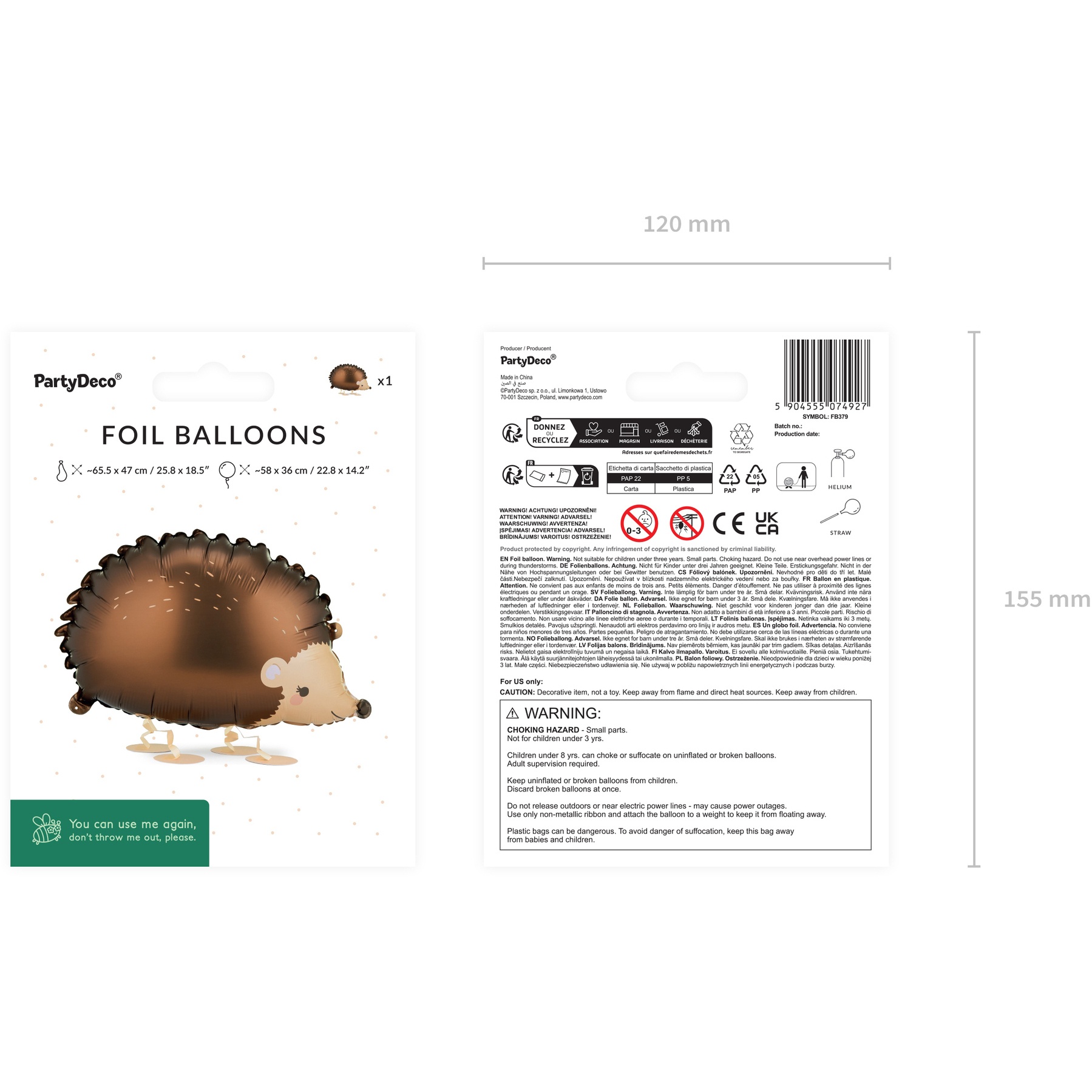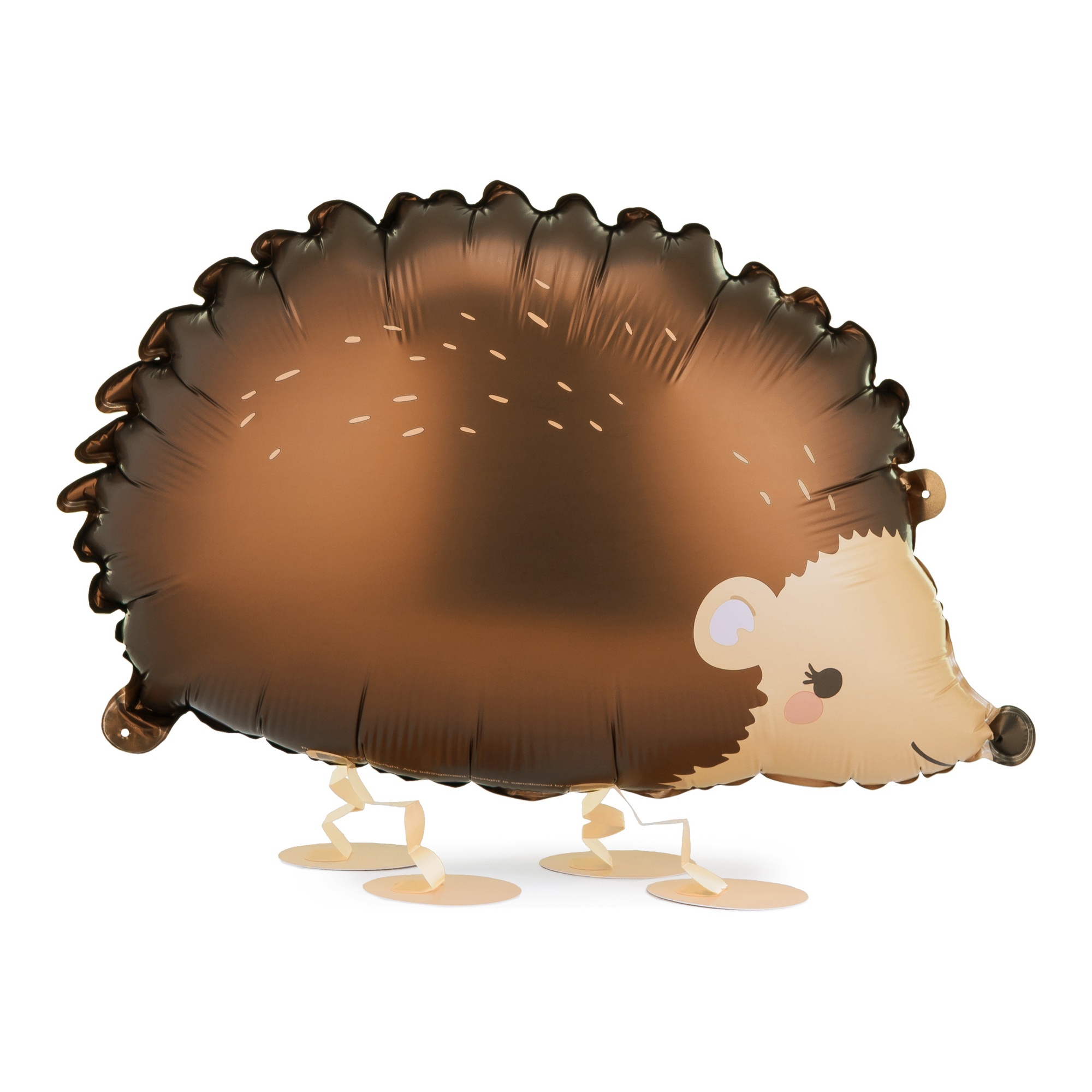 Balão foil em forma de porco?espinho "andante" em tons marrons, com visual simpático e chamativo para decorar festas infantis e aniversários. Dimensões antes da inflação: aprox. 65,5 x 47 cm; após inflação: aprox. 58 x 36 cm. Altura das patas aprox. 10 cm, permitindo que se sustente como se estivesse caminhando sobre superfícies planas. Desenvolvido para enchimento com hélio, acrescenta um detalhe divertido e fotogênico à decoração.