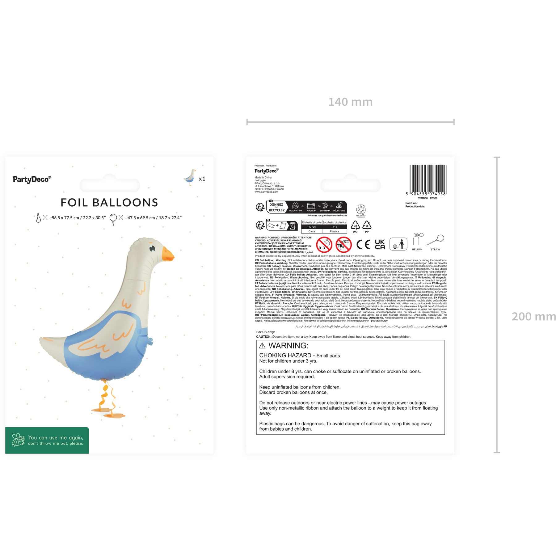 Balão foil ganso tipo walking com design em branco off-white e calça azul-claro, ideal para que o senhor/a senhora decore aniversários e celebrações infantis. Encha-o com hélio para conseguir o característico efeito de movimento.