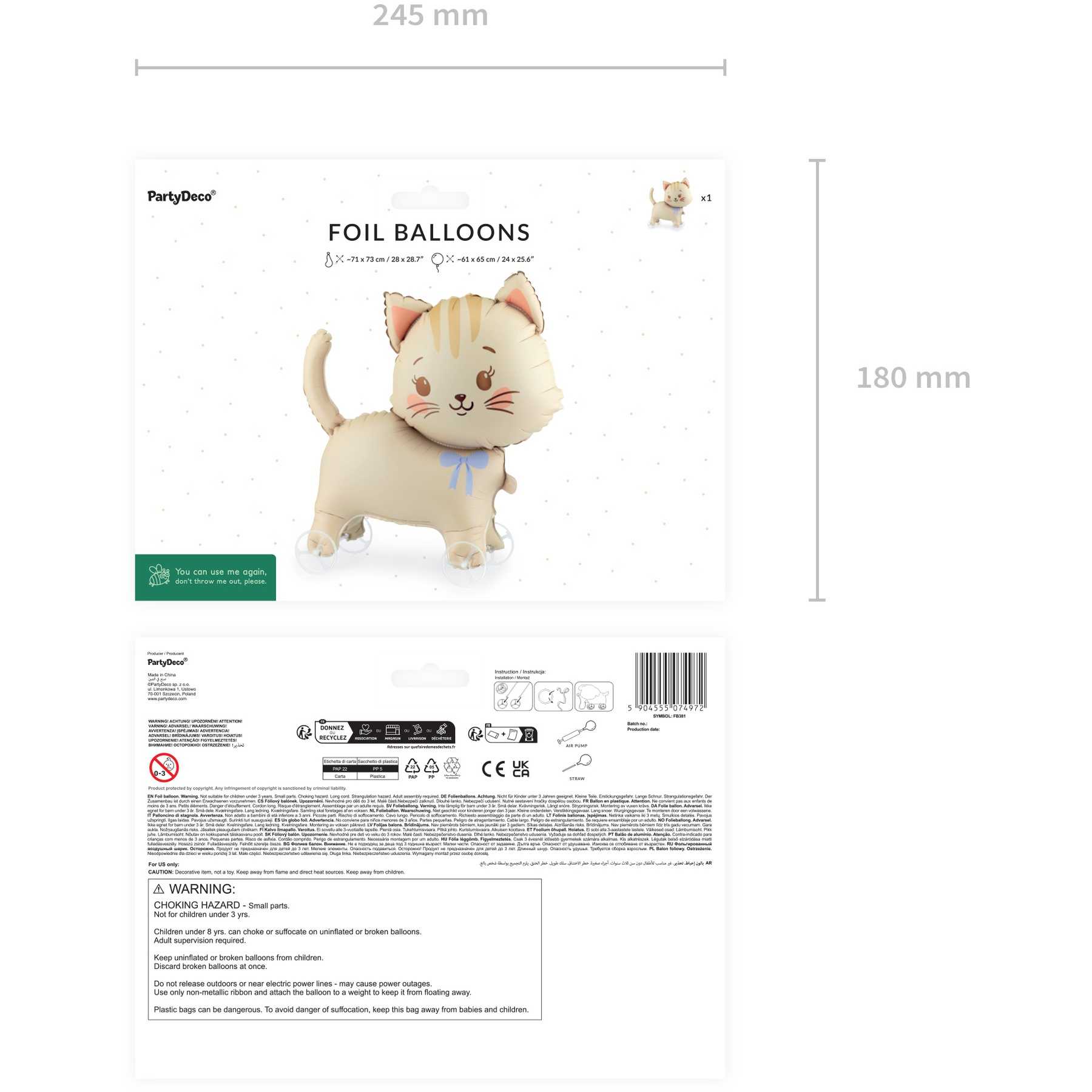 Balão metalizado (foil) em forma de gato, em tom bege claro, concebido para acrescentar um toque terno e divertido a festas infantis. Tamanho aproximado antes do enchimento: 71 x 73 cm; após o enchimento: 61 x 65 cm. Indicado apenas para enchimento com ar, mantém uma silhueta compacta e apelativa que atrai a atenção das crianças. Ideal como peça central decorativa em aniversários e celebrações infantis.