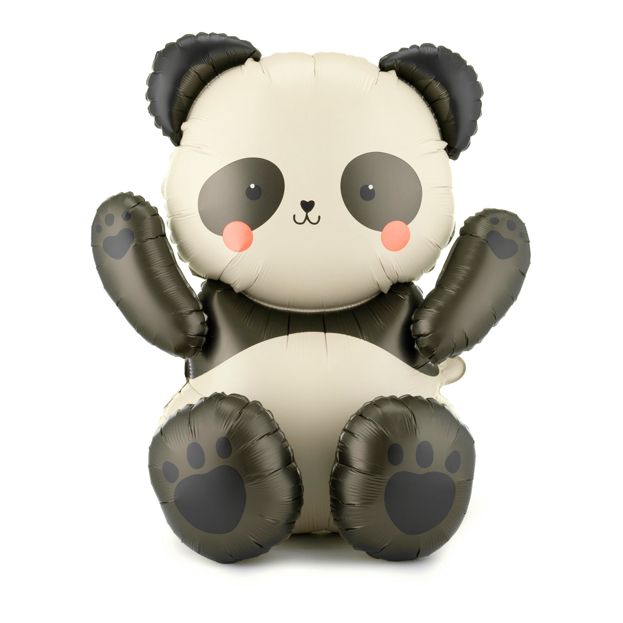 Balão foil em formato de panda, em tons bege e preto, com um design terno e muito atraente.