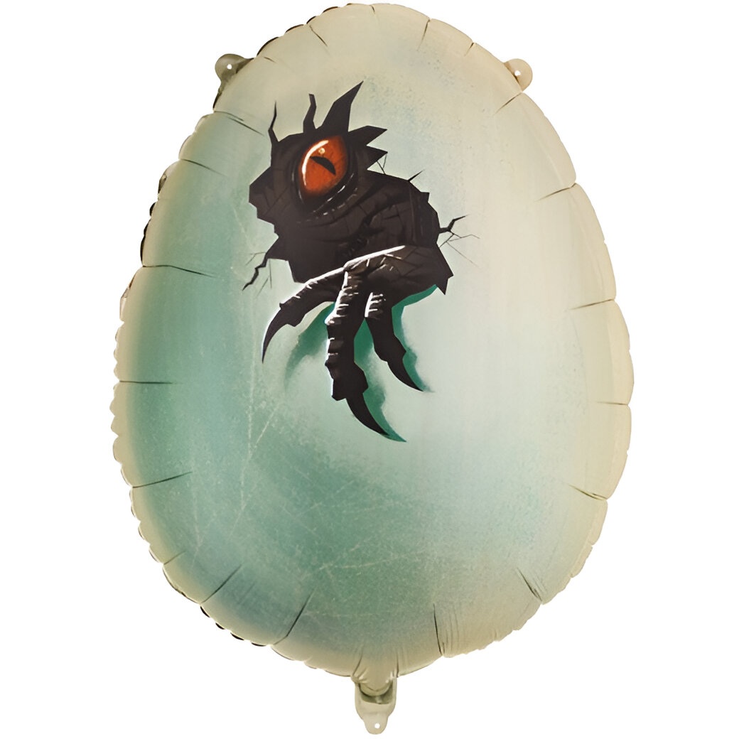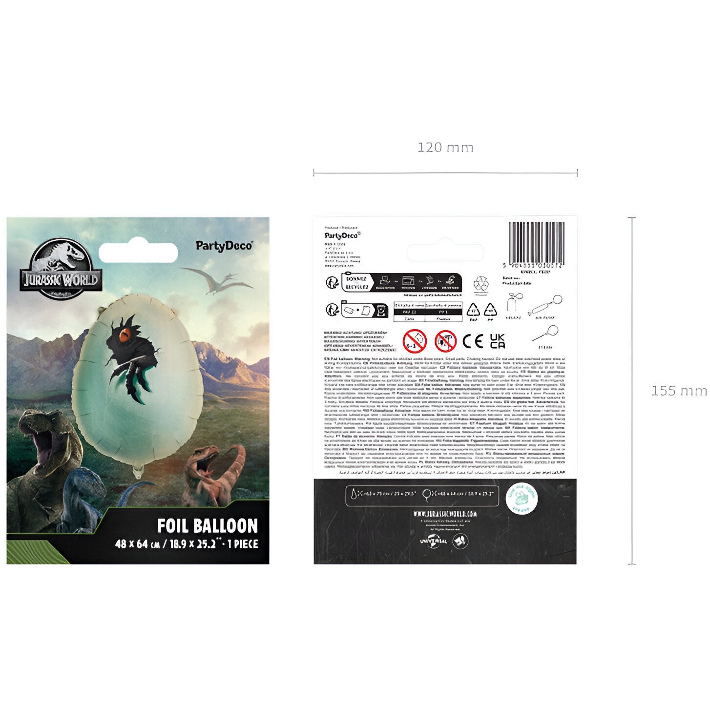 Balão foil licenciado Jurassic World, desenhado como um ovo de dinossauro com impressão realista de olho e garra. Dimensões antes do enchimento: aprox. 63 x 75 cm (25 x 29,5"). Dimensões após o enchimento: aprox. 48 x 64 cm (18,9 x 25,2"). Pode ser enchido com ar ou hélio; o balão é auto-selante e possui argolas para pendurar e decorar com facilidade. Inclui um canudo para facilitar o enchimento.