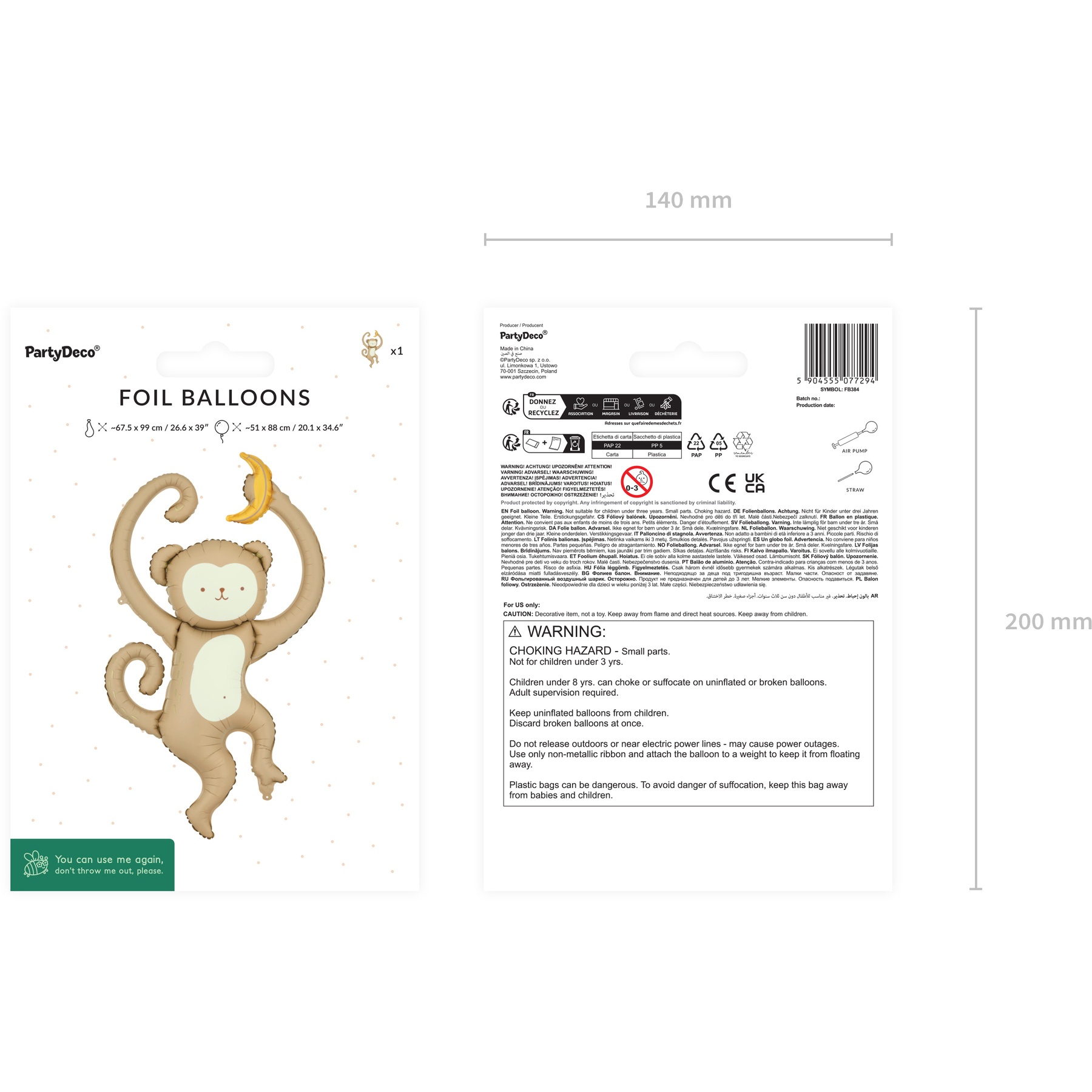Balão foil em formato de macaco nos tons bege e creme, perfeito como peça central nas suas decorações infantis com tema de selva. A expressão doce e o formato original adicionam um toque encantador e acolhedor a aniversários e sessões de fotos. Tamanho antes de inflar aprox. 67.5 x 99 cm; tamanho após inflado aprox. 51 x 88 cm. Projetado para inflar apenas com ar, inclui um canudo para facilitar o enchimento. Leve e chamativo, combina facilmente com guirlandas, outros balões e elementos de decoração temática.