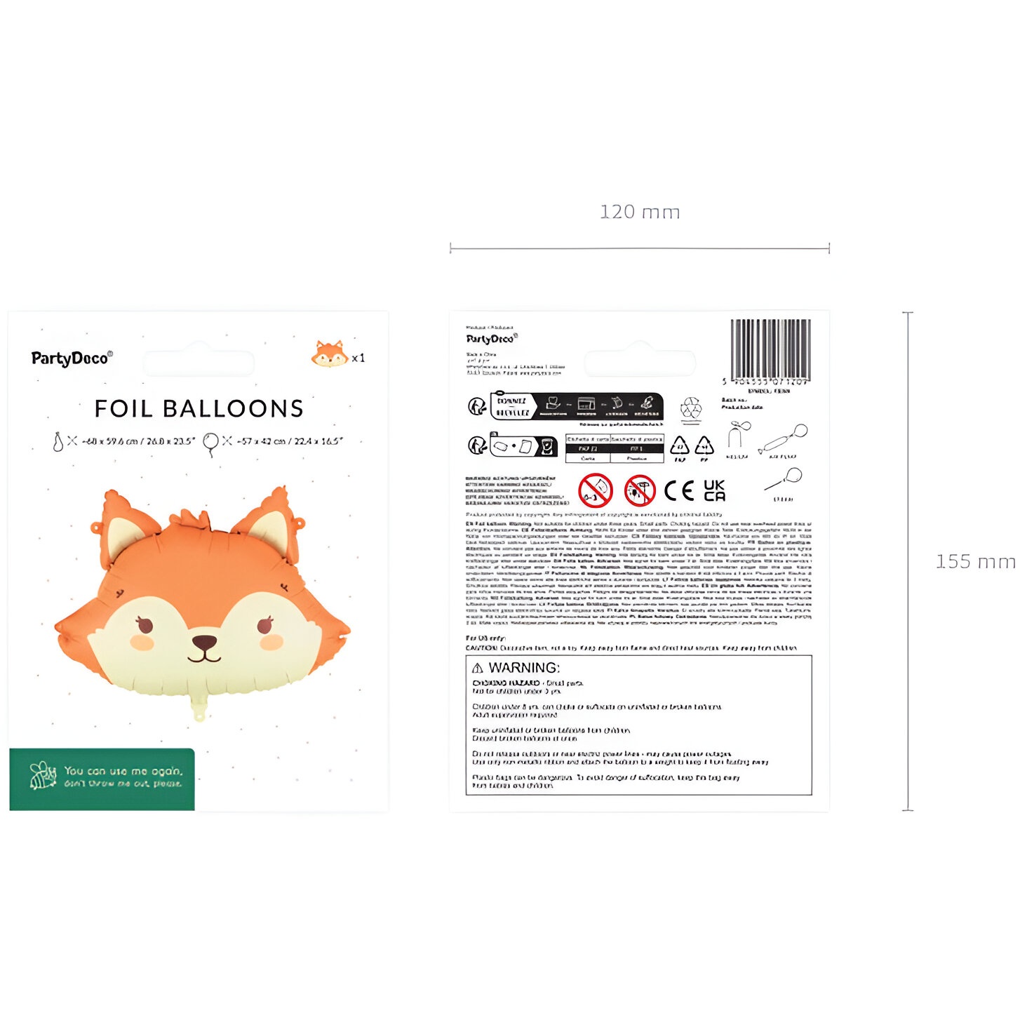 Balão foil em forma de cabeça de raposa em tons laranja e creme. Tamanho antes de encher aprox. 68 x 59,6 cm (26,8 x 23,5''), e após encher aprox. 57 x 42 cm (22,4 x 16,5'').