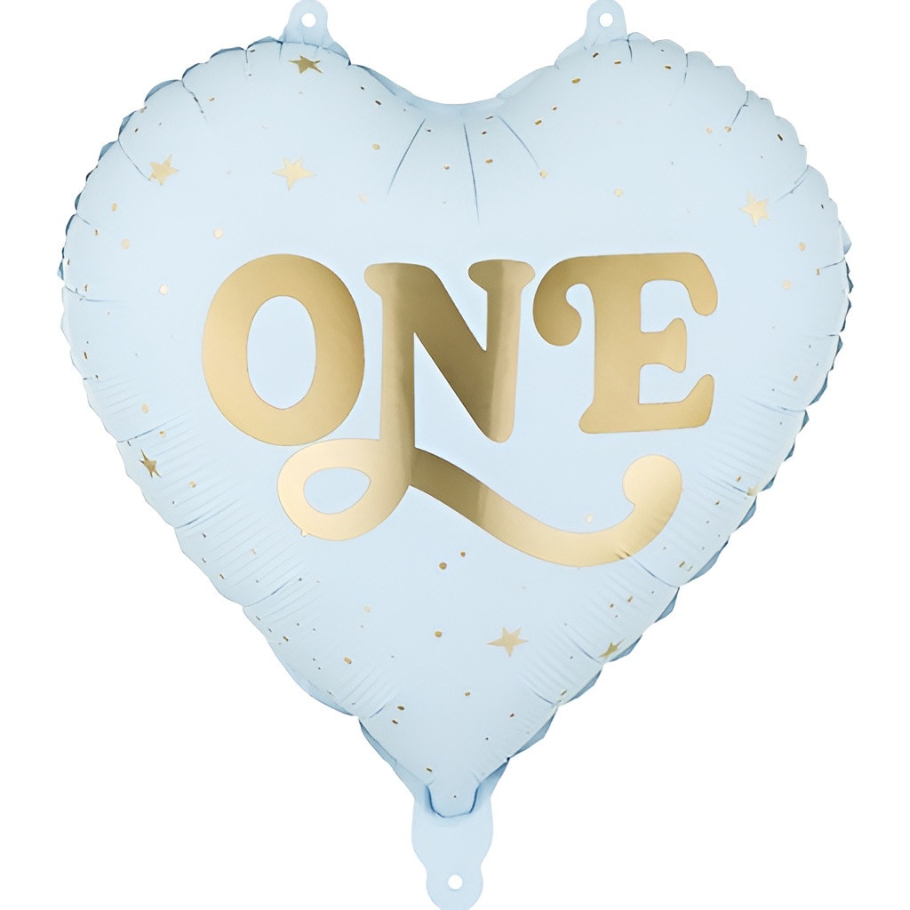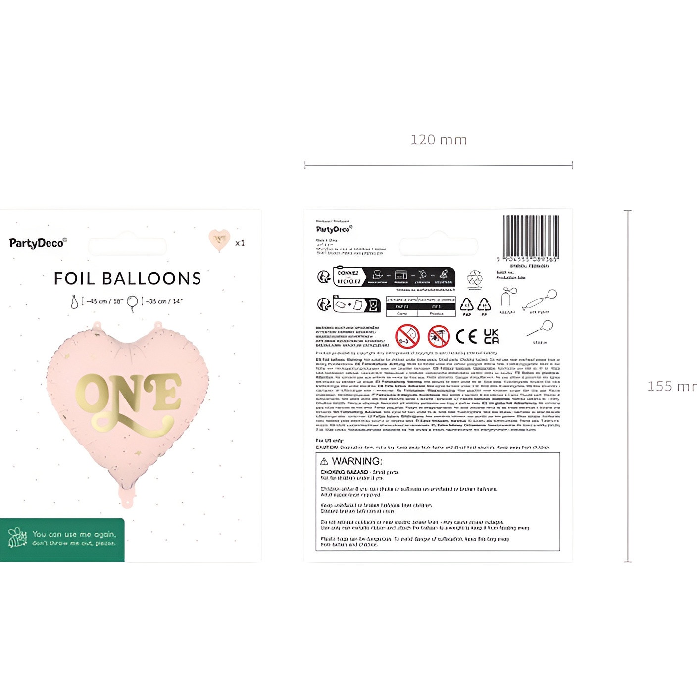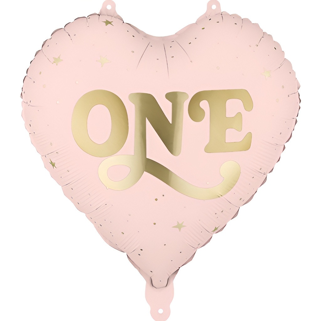 Balão foil em forma de coração, em tom rosa claro, com estampa dourada "ONE", pensado para adicionar um toque elegante à decoração do primeiro aniversário.
