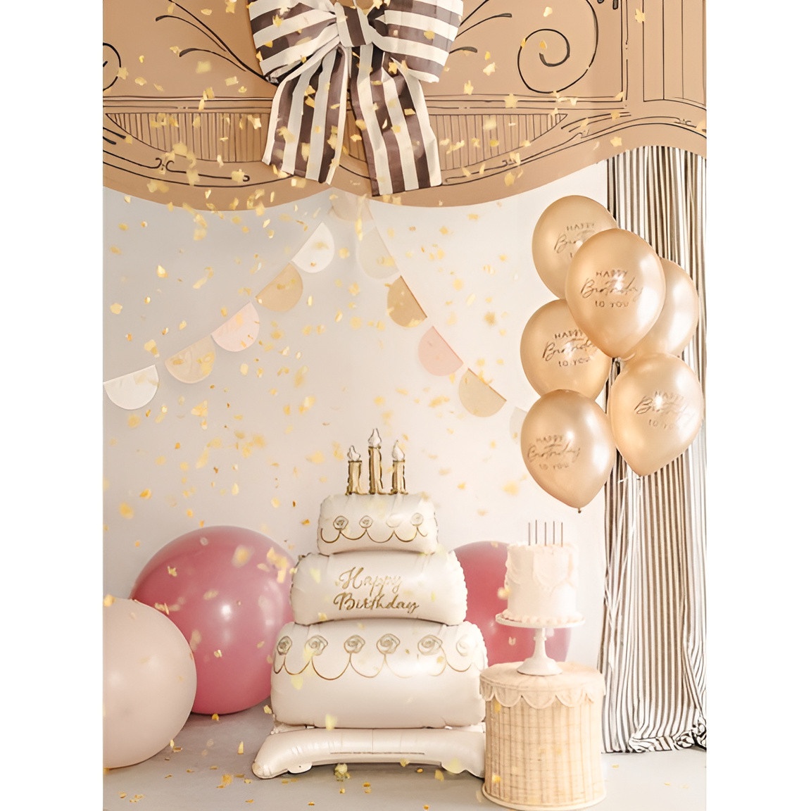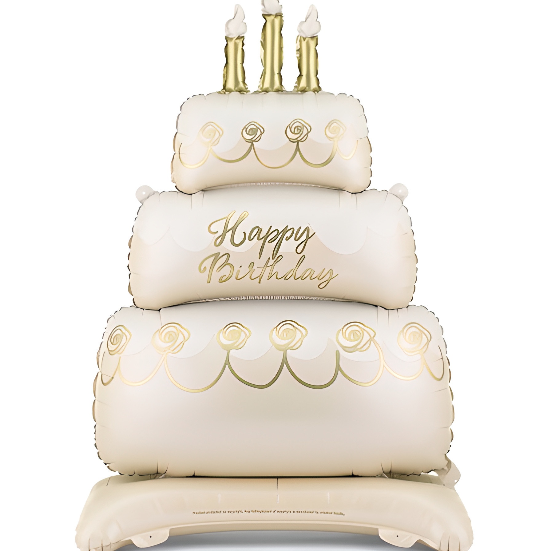 Balão em formato de bolo de três andares, em tons bege e dourado, que acrescenta um toque sofisticado a qualquer celebração. Acabamento refinado com detalhes dourados que se destacam sobre a base neutra. Peça autoportante, com grande presença, ideal como centro de mesa sem ocupar muito espaço. Tamanho aproximado após enchimento: 70 x 100 cm. Deve ser enchido apenas com ar.