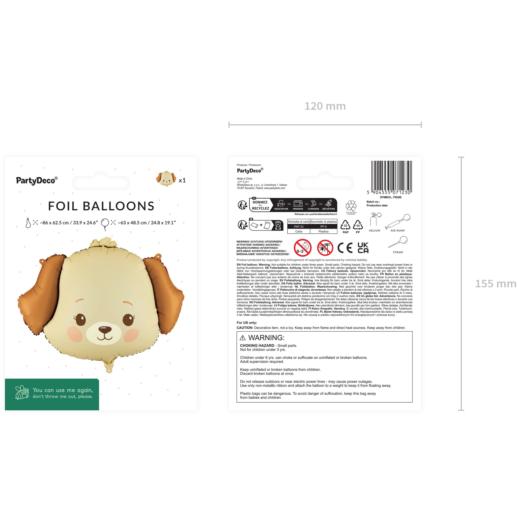 Balão com simpático desenho de cachorrinho em tons bege e castanho. Tamanho aproximado após o enchimento: 63 x 48,5 cm; tamanho sem inflar: 86 x 62,5 cm. Compatível com enchimento a ar ou a hélio, confere um toque divertido e fofo a qualquer decoração infantil. Leve e vistoso, ideal para mesas de doces, painéis para fotos e cantinhos de festa.