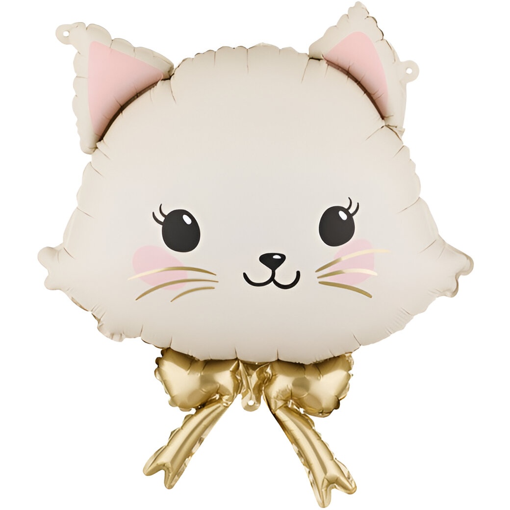 Balão foil em formato de rosto de gato, estilo kawaii, em tons creme e rosa claro, com um laço dourado brilhante. Confere um toque doce e elegante a festas infantis e cenários para fotos.