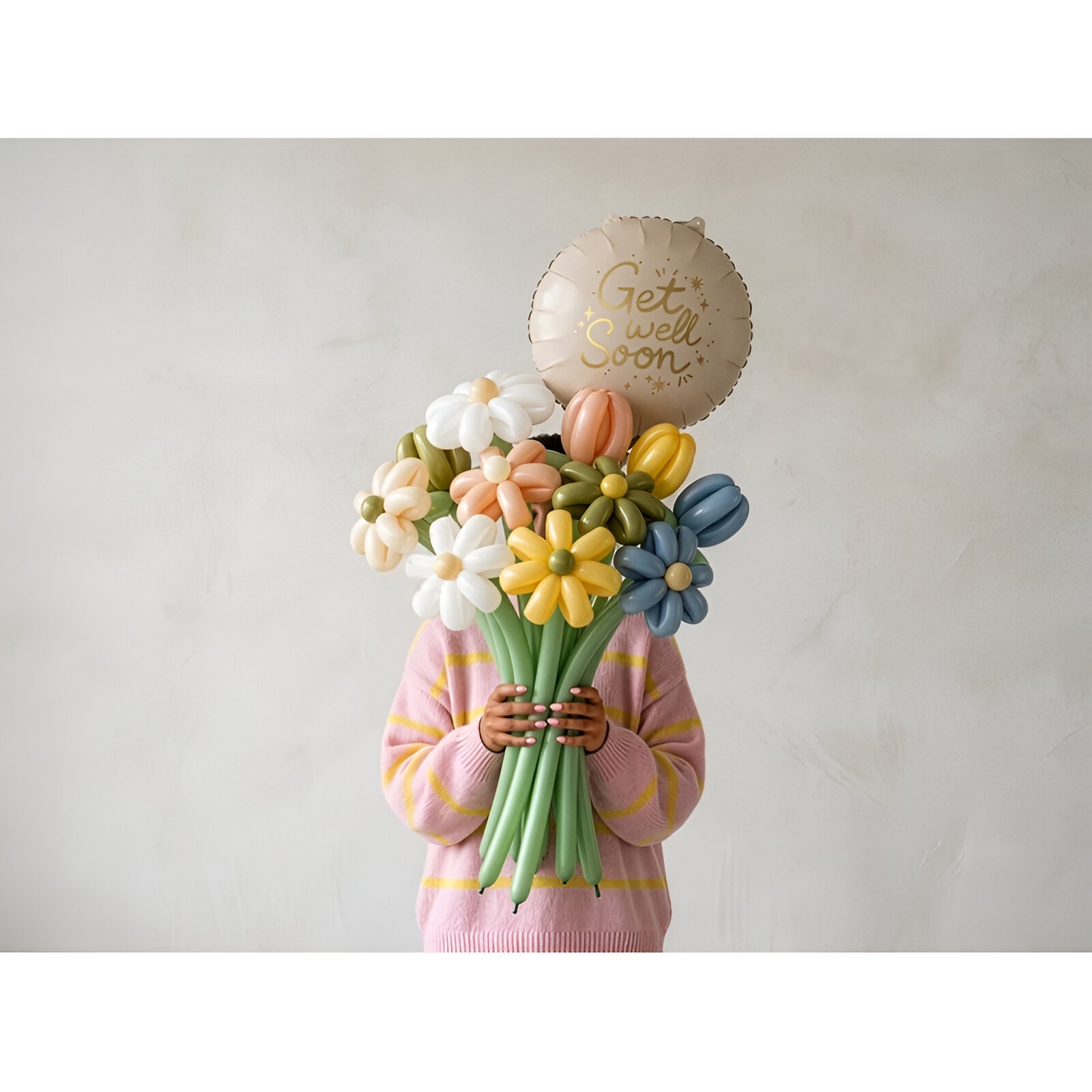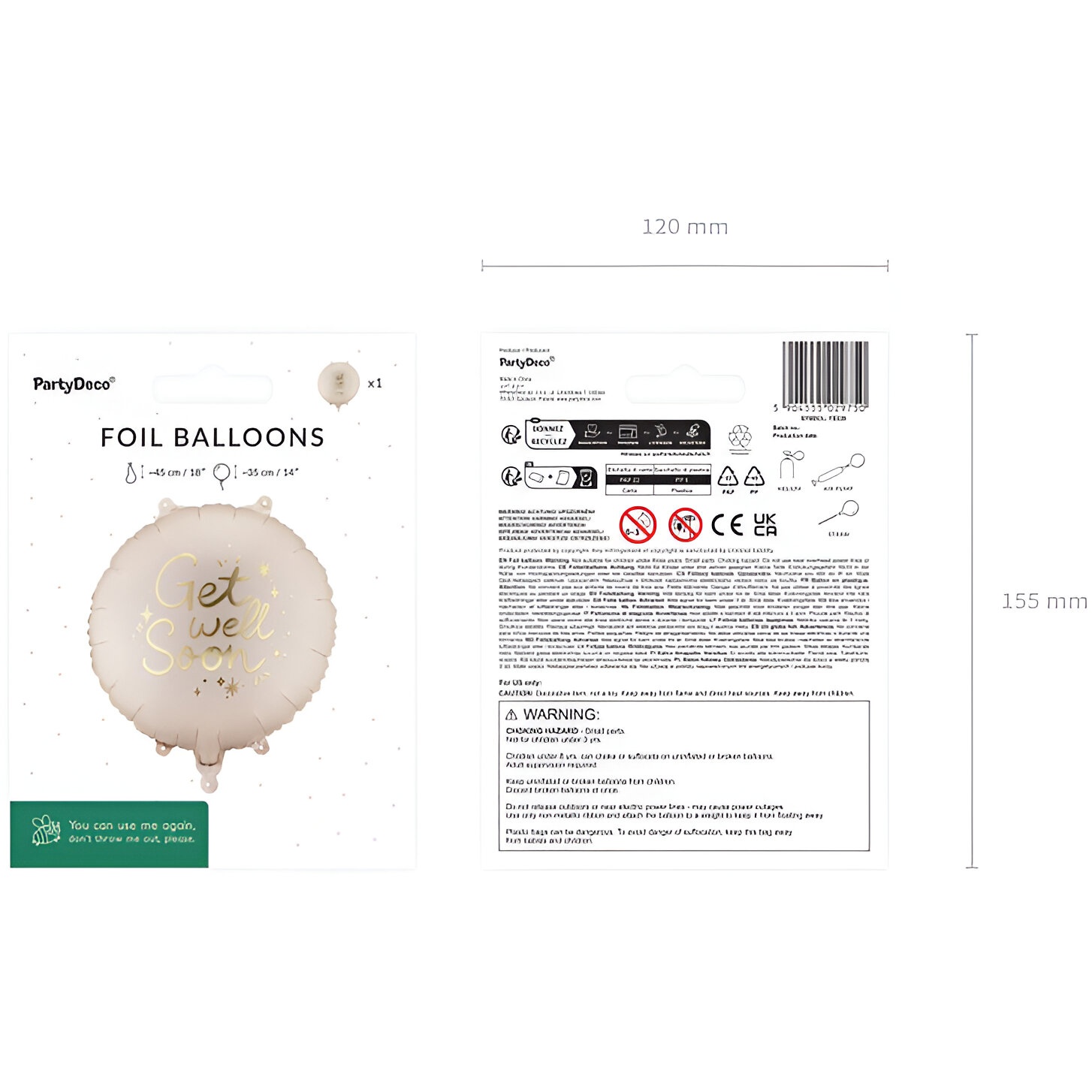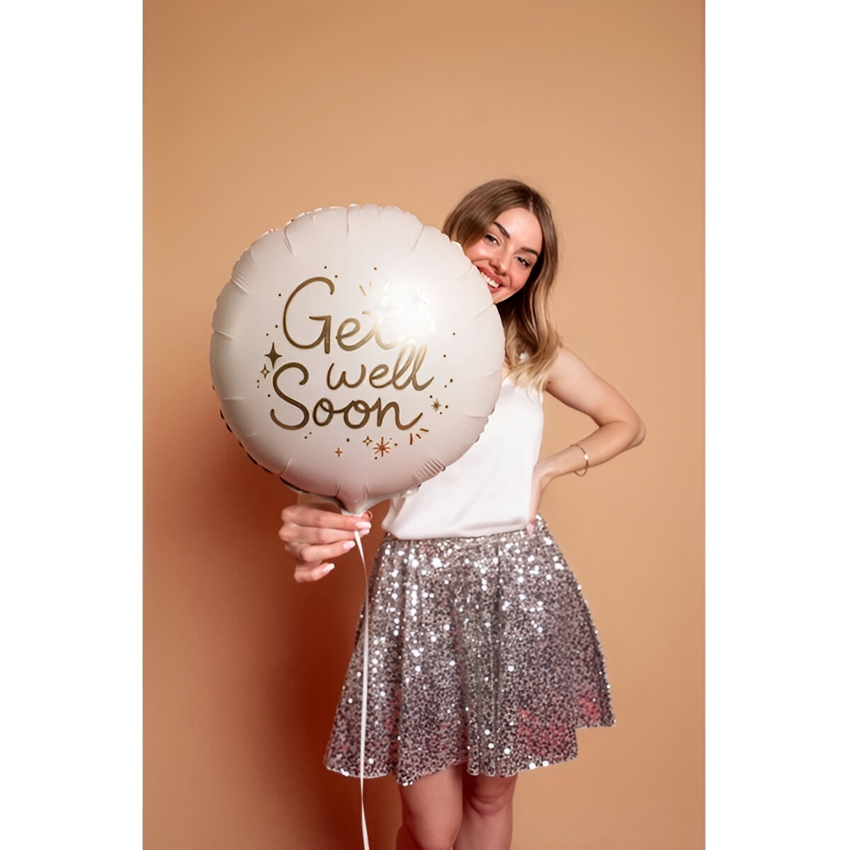 Balão foil redondo com a inscrição reconfortante "Get Well Soon" em dourado elegante sobre fundo bege. Ideal para que o(a) senhor(a) ofereça como mimo em visitas ou presente de recuperação, conferindo um toque sofisticado e afetuoso. Inflável com ar ou hélio, mantém a forma graças ao material foil. Tamanho aproximado após inflado: 35 x 35 cm.