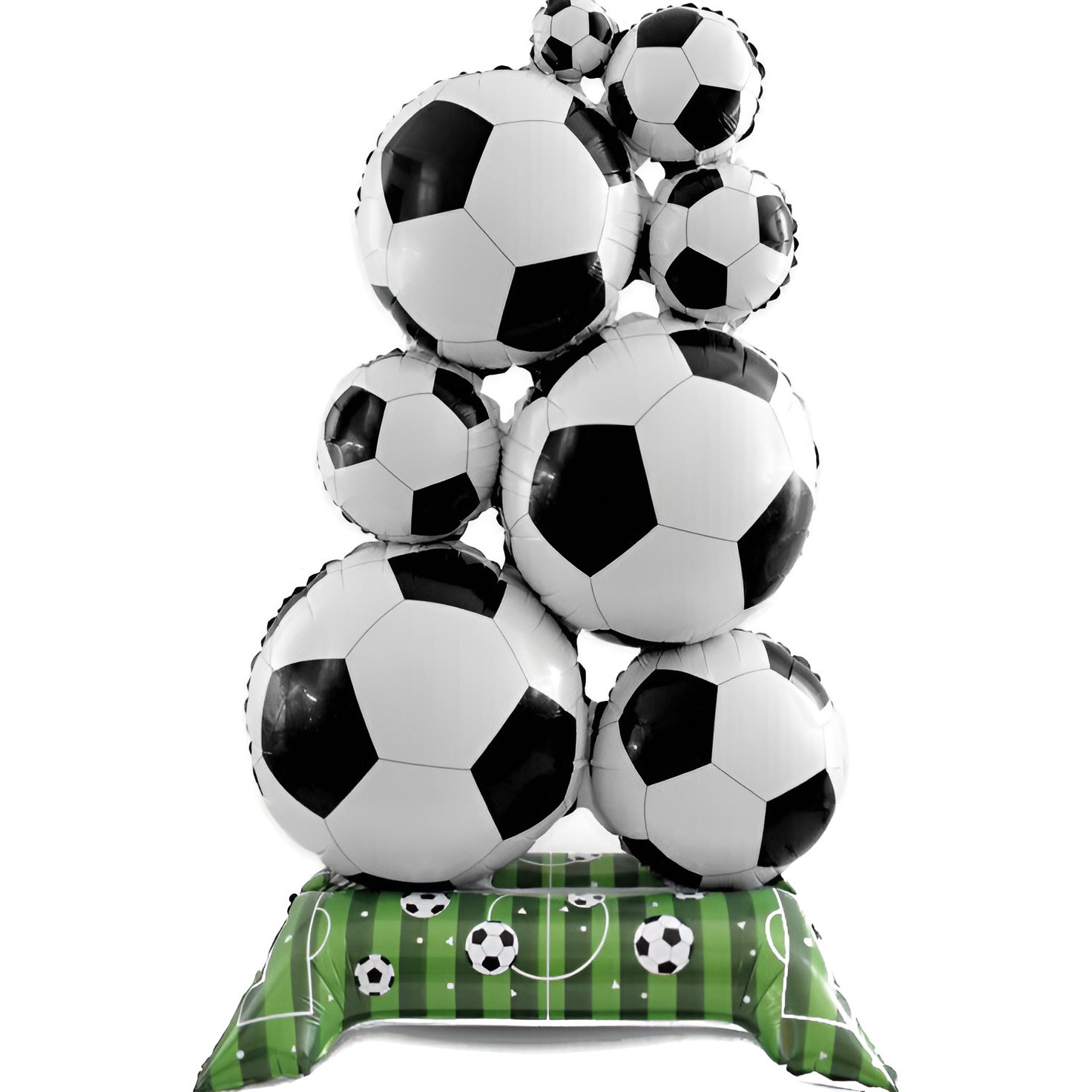 Balão foil gigante com estampa de campo de futebol e múltiplas bolas, que proporciona grande impacto visual em qualquer celebração esportiva ou festa infantil. A base com estampa de relva funciona como suporte decorativo e valoriza a composição. Perfeito para criar pontos de atenção em aniversários, eventos temáticos e sessões de fotos memoráveis.