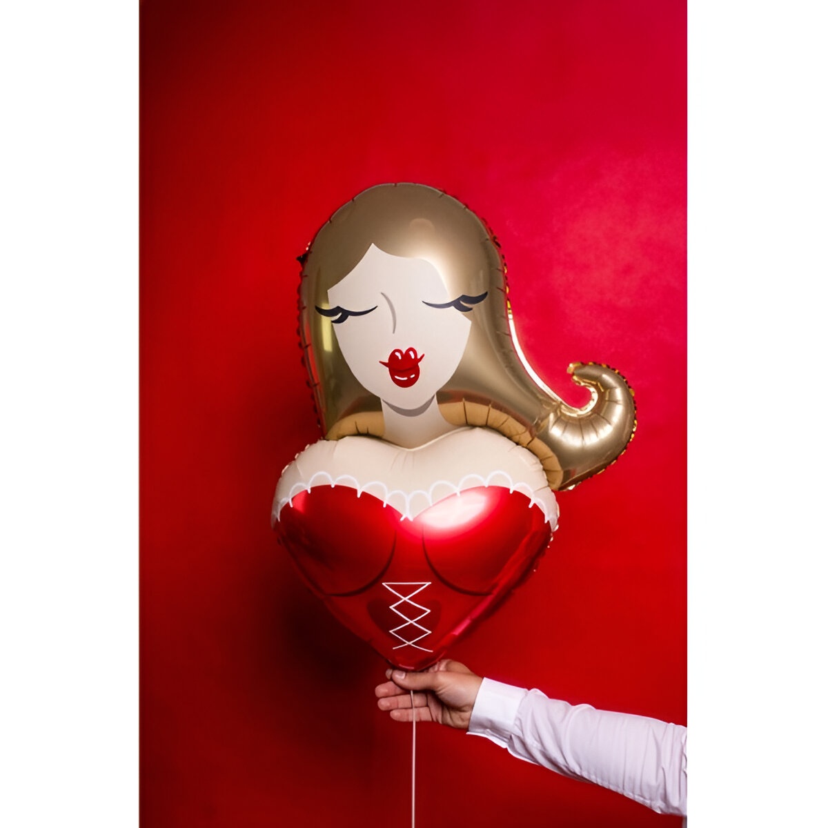 Balão decorativo com design feminino: figura de mulher loira sobre um grande coração vermelho com detalhes dourados e lábios marcantes. Perfeito para despedidas de solteira e celebrações que pedem um toque elegante e divertido. Tamanho aproximado antes de inflar 66 x 94,5 cm e depois de inflado 57 x 74,5 cm. Pode ser enchido com ar ou hélio para se adaptar à decoração desejada.