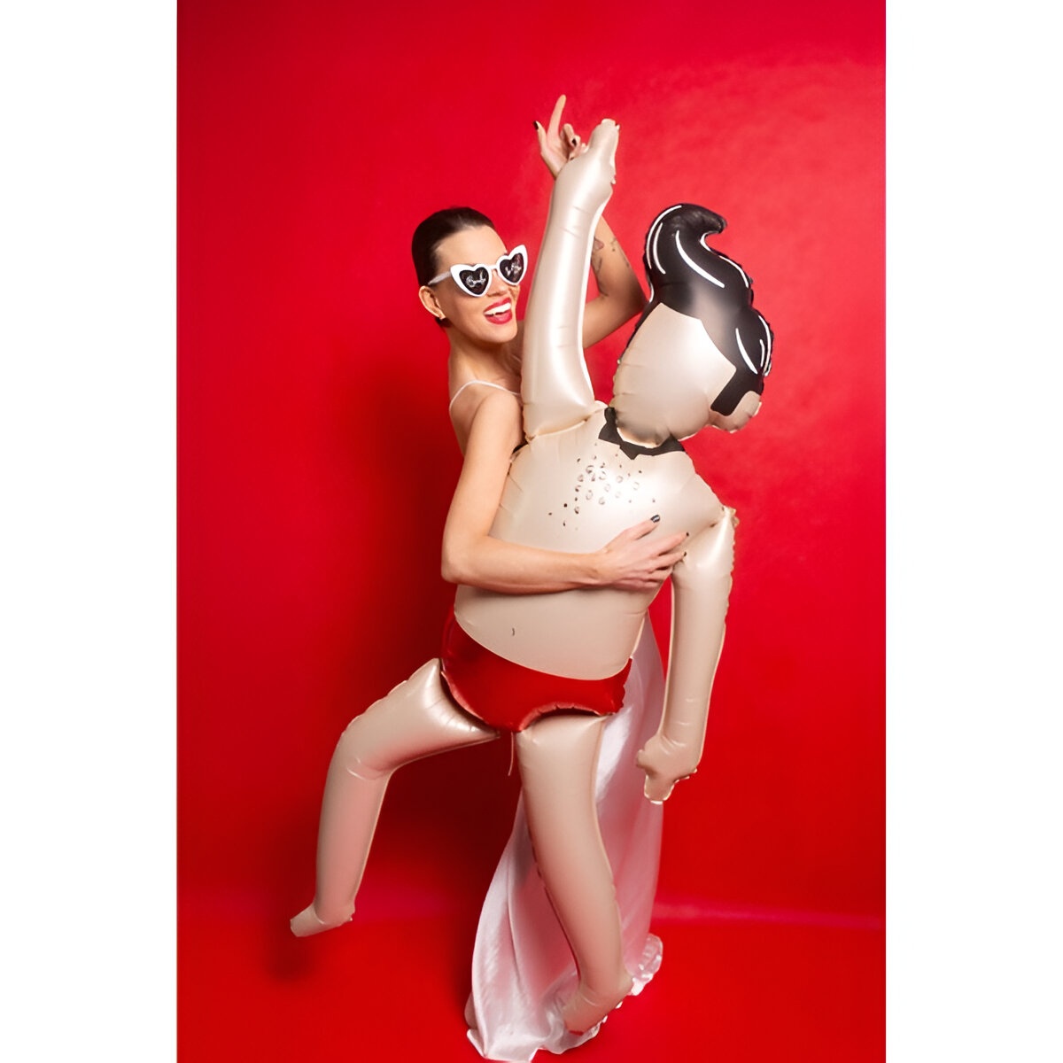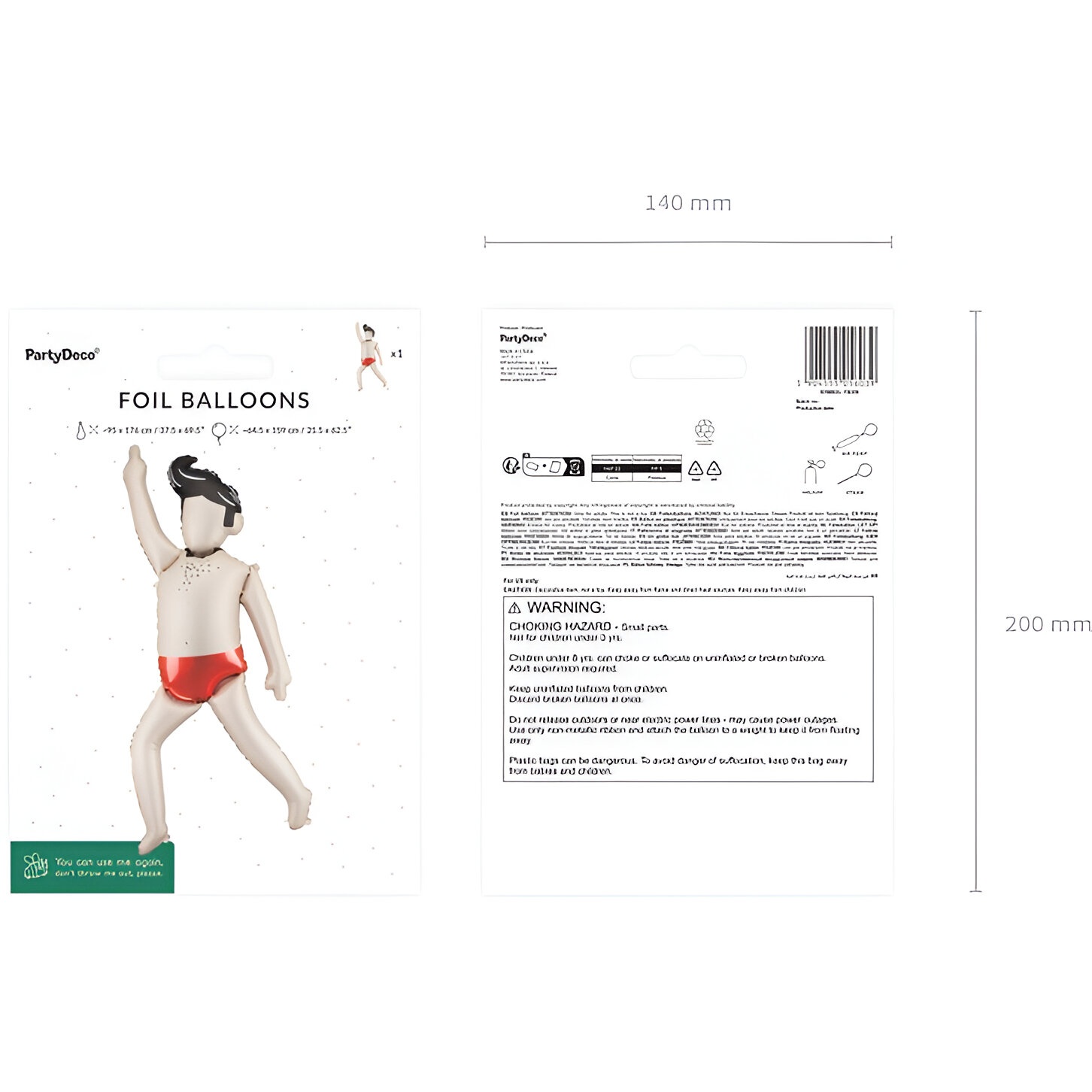 Balão foil gigante com a figura de um homem em tons creme e vermelho, cabelo preto e detalhes divertidos. Antes de inflar mede aproximadamente 95 x 176 cm; uma vez inflado atinge cerca de 64,5 x 159 cm. Pode ser enchido com ar ou hélio para se adaptar a diferentes montagens e decorações. Acrescenta um elemento chamativo e fotogénico a photocalls, aniversários e celebrações, criando uma atmosfera divertida e original. Design leve que facilita a sua colocação e a combinação com outros elementos de festa.