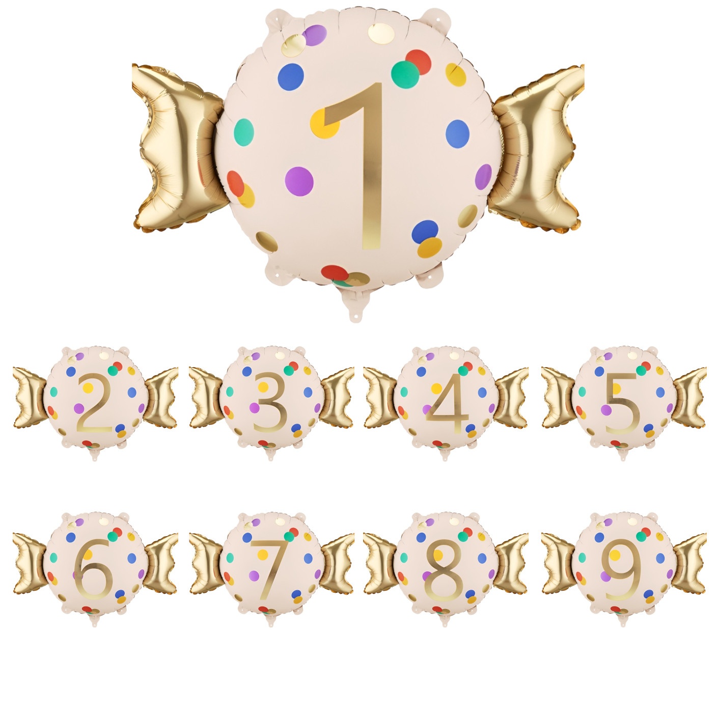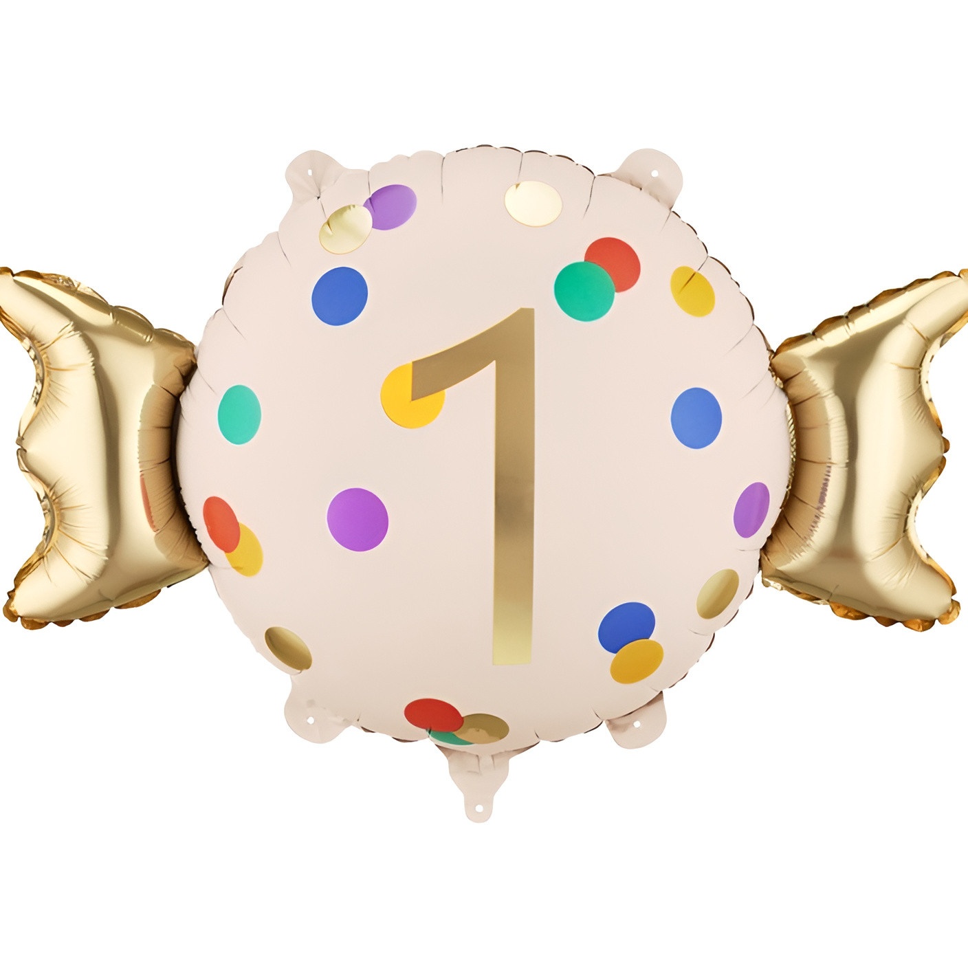 Balão decorativo com o número 1 em uma combinação elegante de bege e dourado. Apresenta um desenho estilo "candy" com bolinhas coloridas que confere um toque festivo e sofisticado. Tamanho aproximado antes de inflar: 76,5 x 48 cm; tamanho após inflar: 61 x 37 cm. Pode ser inflado com ar ou hélio e foi pensado para criar um ponto focal na celebração. Ideal para o primeiro aniversário, sessões de fotos e para decorar mesas de doces ou cantos especiais.
