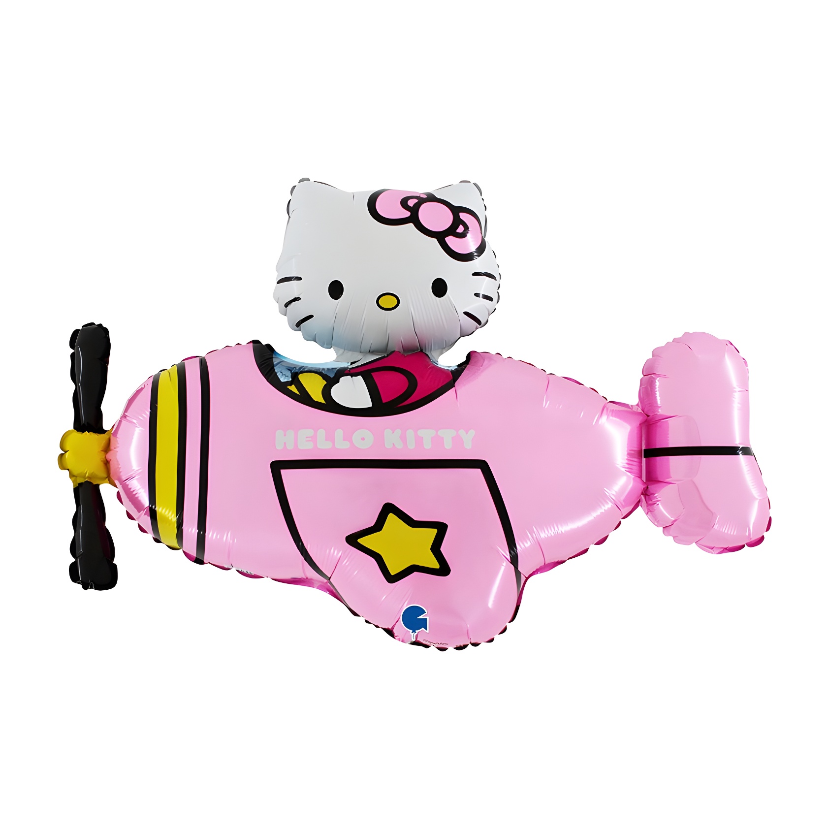 Balão com a icônica Hello Kitty num divertido formato de avião rosa, perfeito para dar um toque alegre a qualquer festa infantil.