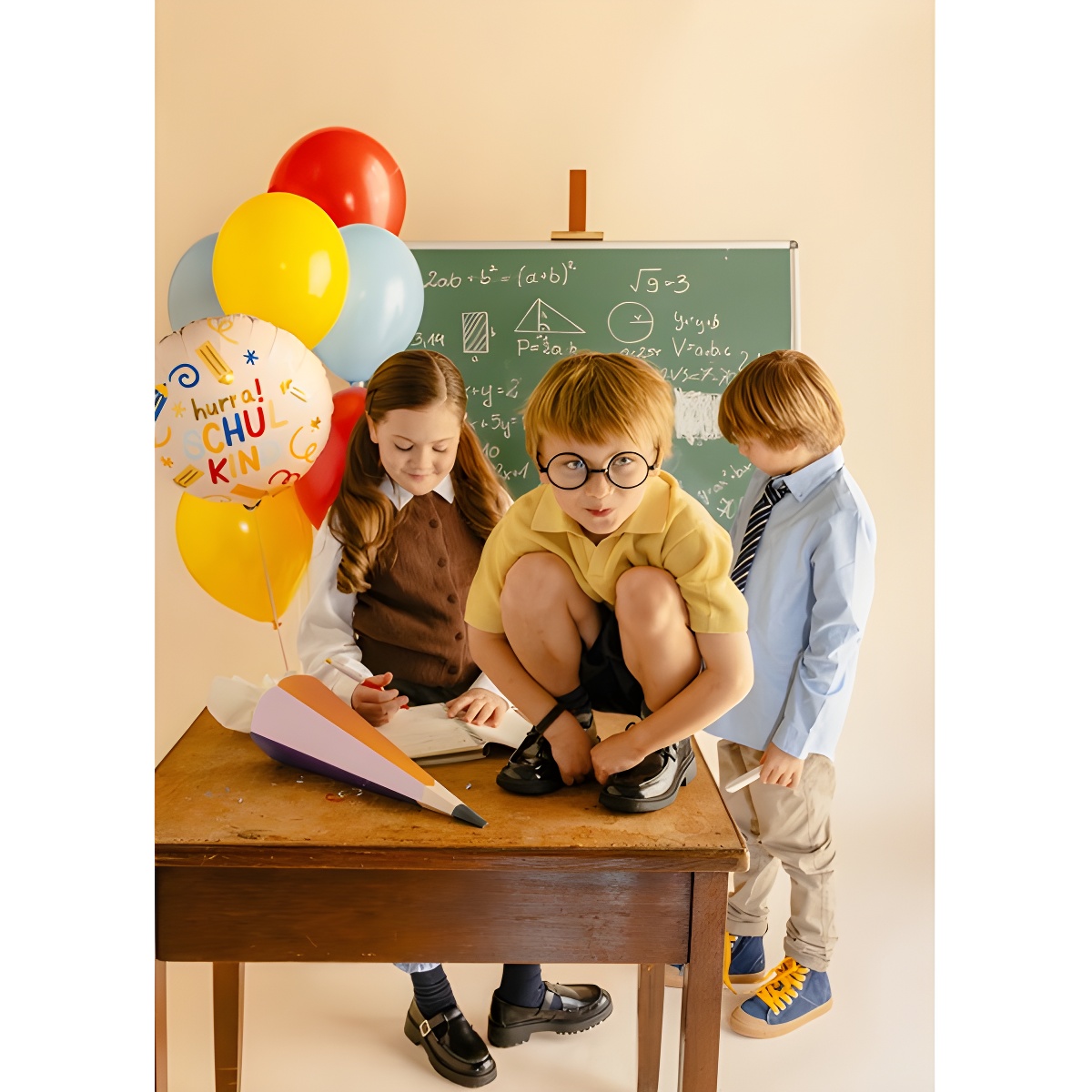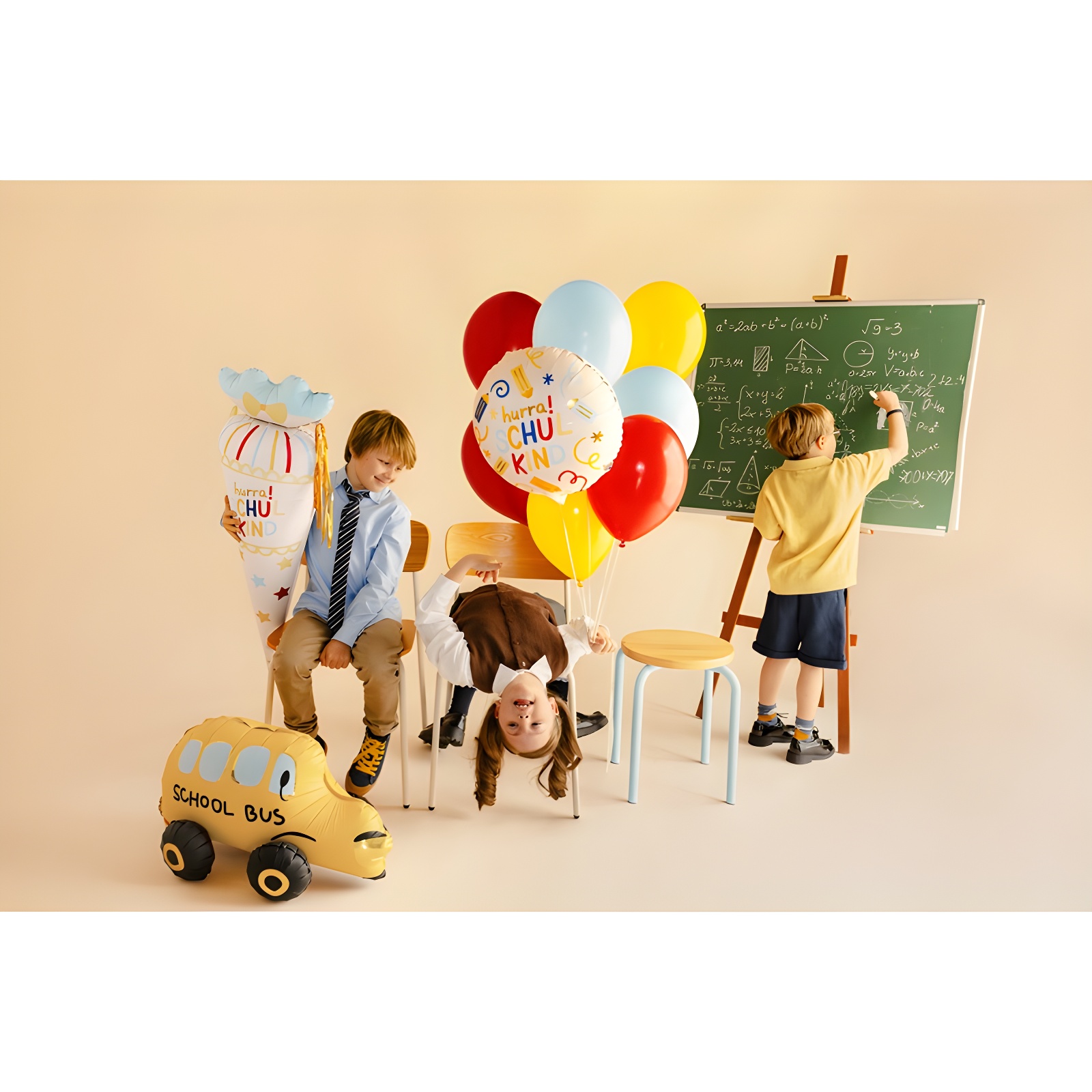 Balão decorativo com o texto Hurra Schulkind e motivos escolares em tons creme e cores vivas. Seu design alegre confere um toque festivo, ideal para celebrações relacionadas à escola.