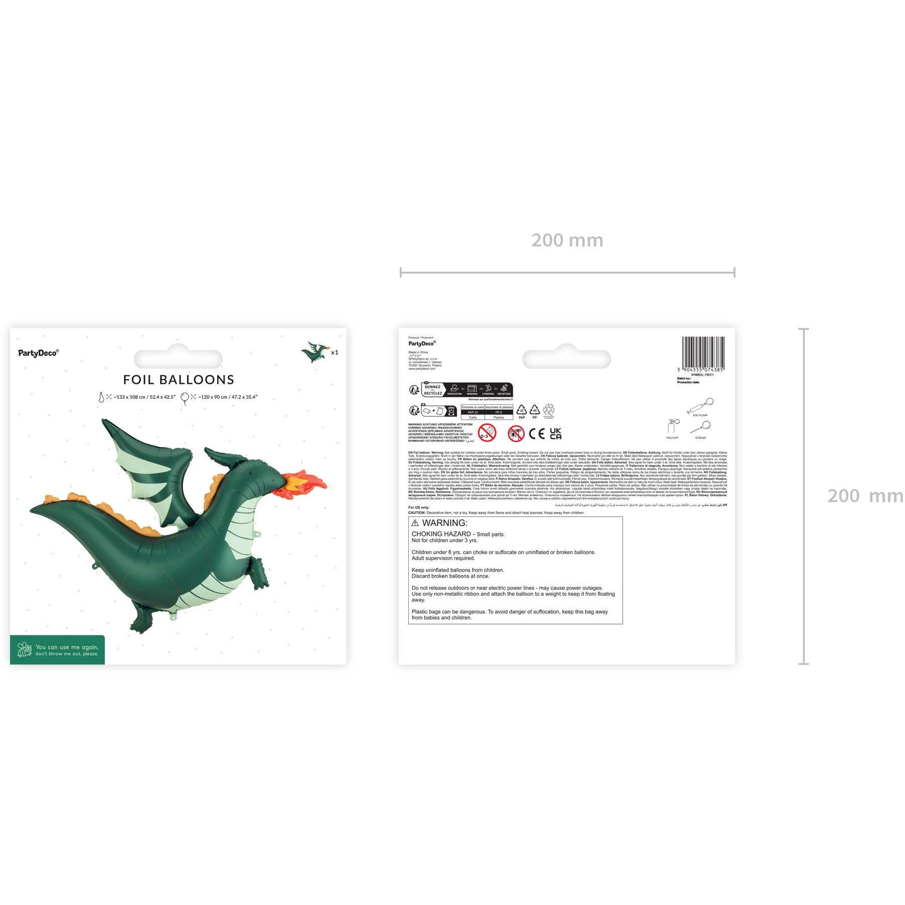 Balão em forma de dragão em tons verde-escuro e menta, com detalhe de chamas na boca que acrescenta um toque divertido e espetacular às celebrações infantis.