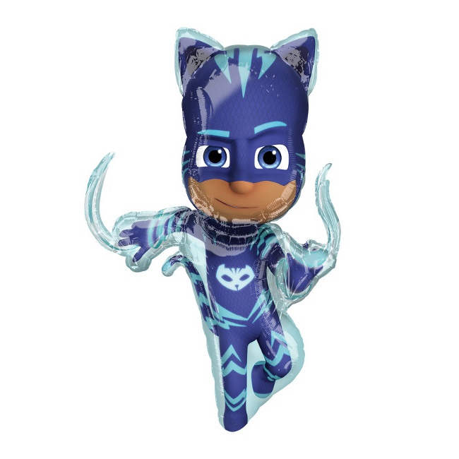 Balão de alumínio da famosa personagem PJ Masks, o Gatuno, que pode ser insuflado com ar ou hélio.