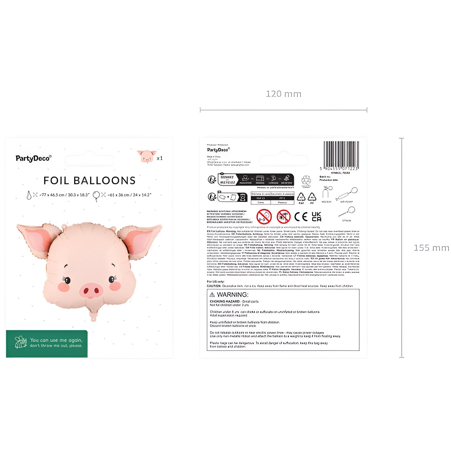 Balão metalizado (foil) oficial da Peppa Pig, na cor rosa, com o rostinho característico da personagem. Tamanho sem encher aprox. 77 x 46,5 cm; tamanho após encher aprox. 61 x 36 cm. Apto para enchimento com ar e com hélio - perfeito para que o senhor/a senhora decore festas infantis e acrescente um toque divertido e reconhecível a qualquer ambiente. O conjunto inclui uma palhinha para facilitar o enchimento.