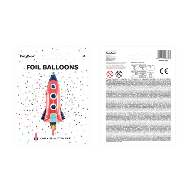 Feito de papel de alumínio, este balão reproduz a forma de um foguetão vermelho, com ailerons e vigias azuis e pormenores como o fogo das hélices. Pode insuflá-lo com ar ou hélio de uma forma rápida e fácil.