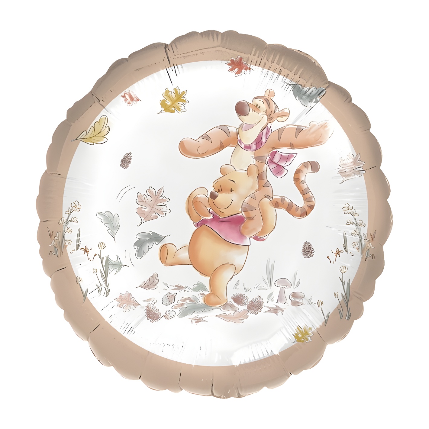 Balão foil com design oficial da Disney protagonizado por Winnie the Pooh e Tigrão, com ilustrações em tons suaves e um detalhe outonal que traz um ar terno e alegre a qualquer festa infantil.