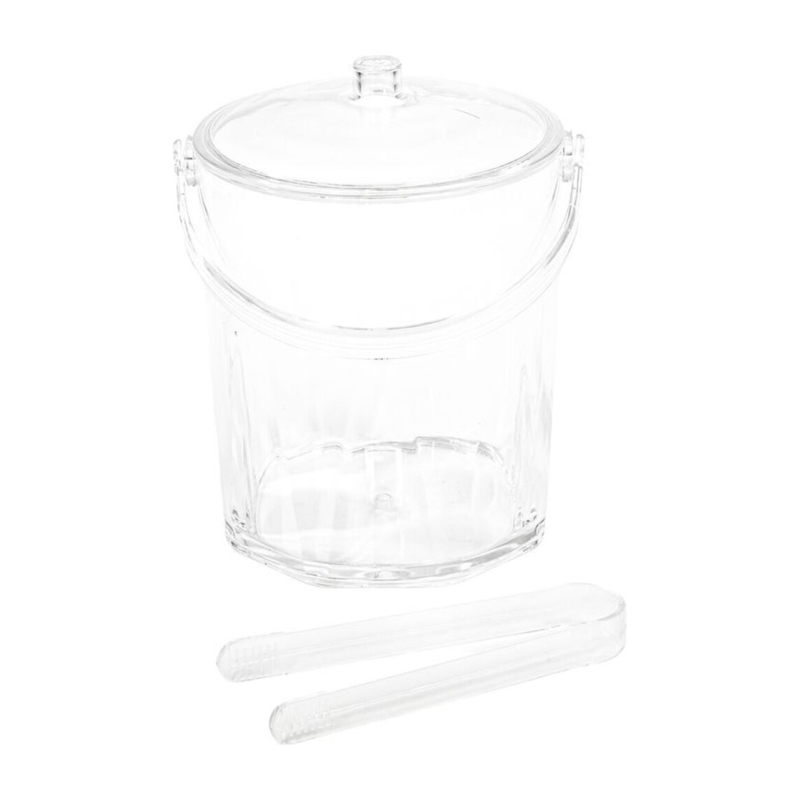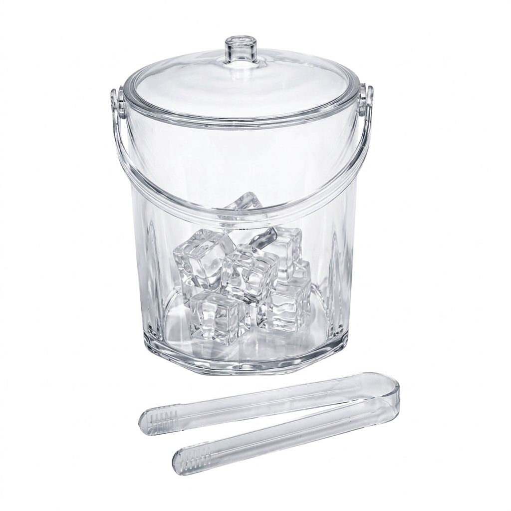 Balde de gelo transparente em acrílico com pinças, concebido para servir gelo com estilo e praticidade.
