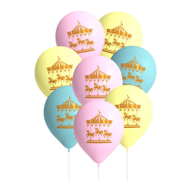 Um conjunto de balões de cores variadas com um elegante padrão de carrossel de cavalos dourados, pode usá-los para decorar qualquer festa, dando um toque de alegria e cor.