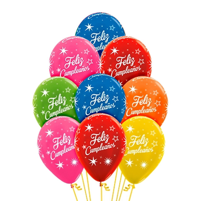 Este sortido de 12 balões de látex surpreende pelas suas atraentes estampas brancas sobre os fundos vermelho, azul, rosa, verde, amarelo e laranja de cada balão. A impressão mostra a inscrição "Happy Birthday" rodeada de estrelas de diferentes formas e tamanhos.