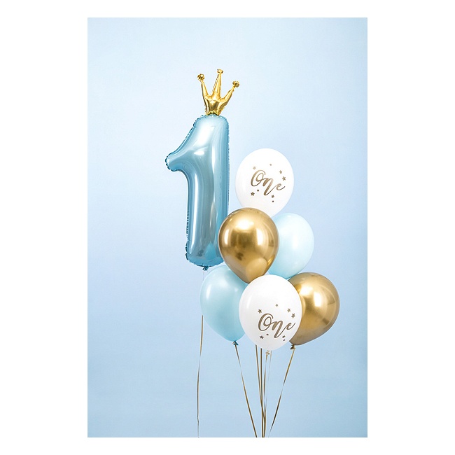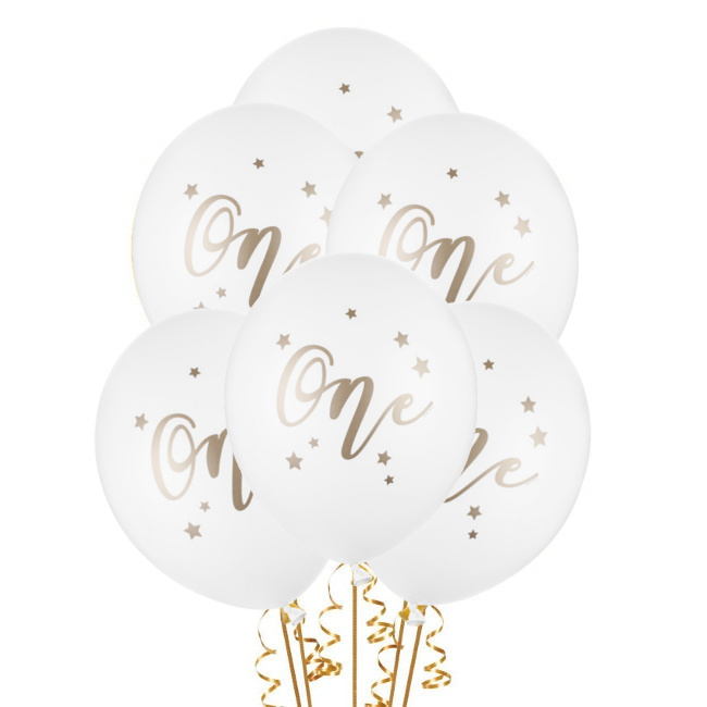 Balões de látex brancos com as letras "One" em dourado caligráfico e estrelas.