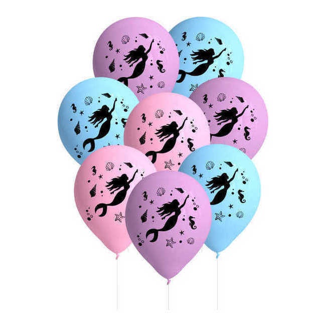 Um conjunto de balões em cores sortidas, com uma sereia sinuosa a nadar entre cavalos marinhos e conchas, pode utilizá-los para decorar qualquer festa, darão um toque de alegria e cor.