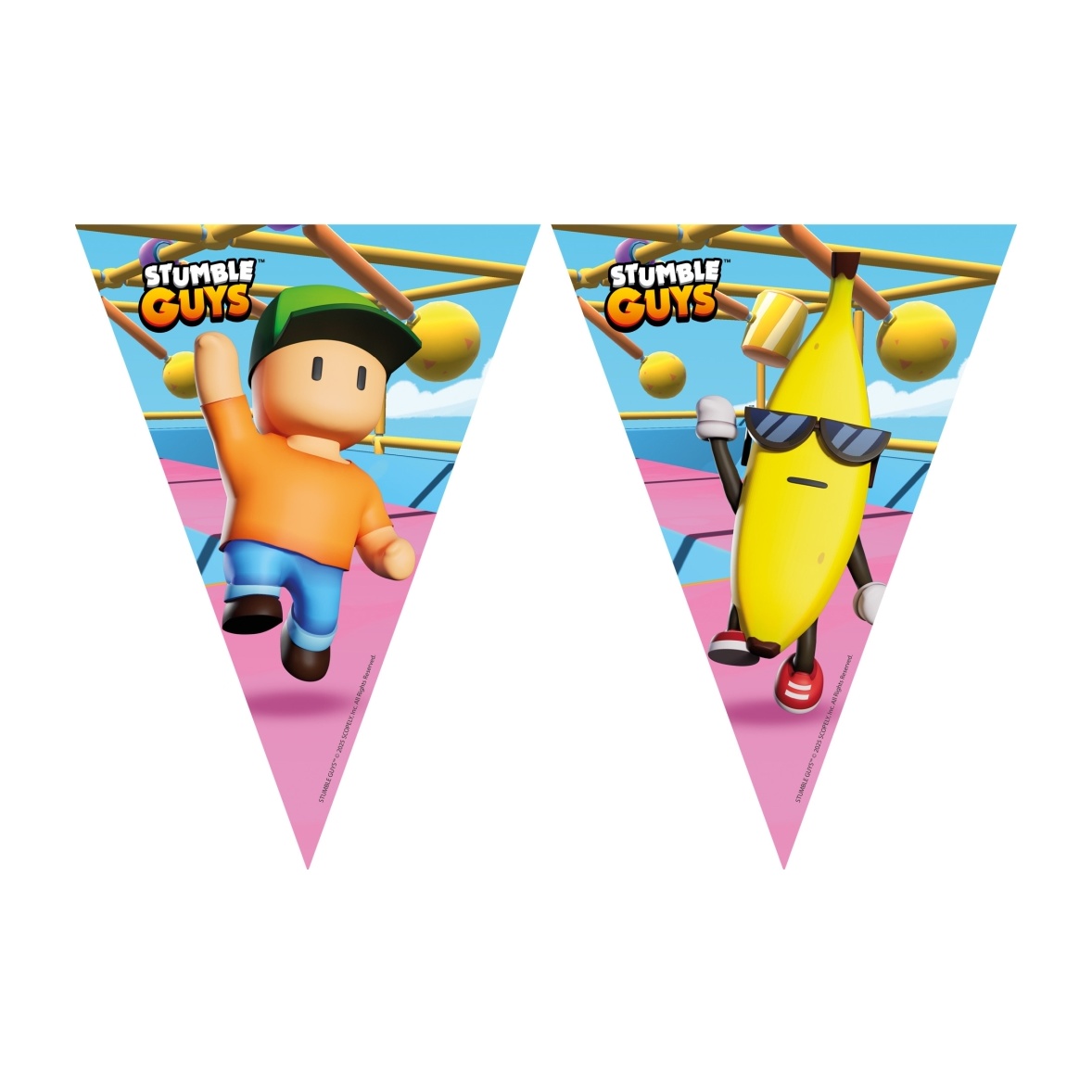 Decore as suas celebrações com a divertida estética de Stumble Guys. Bandeirola triangular com personagens coloridos e design marcante que acrescenta energia e temática de videojogos às festas infantis. Impressa em papel com acabamento brilhante que preserva as cores vivas. Apresentação: 1 unidade por embalagem.