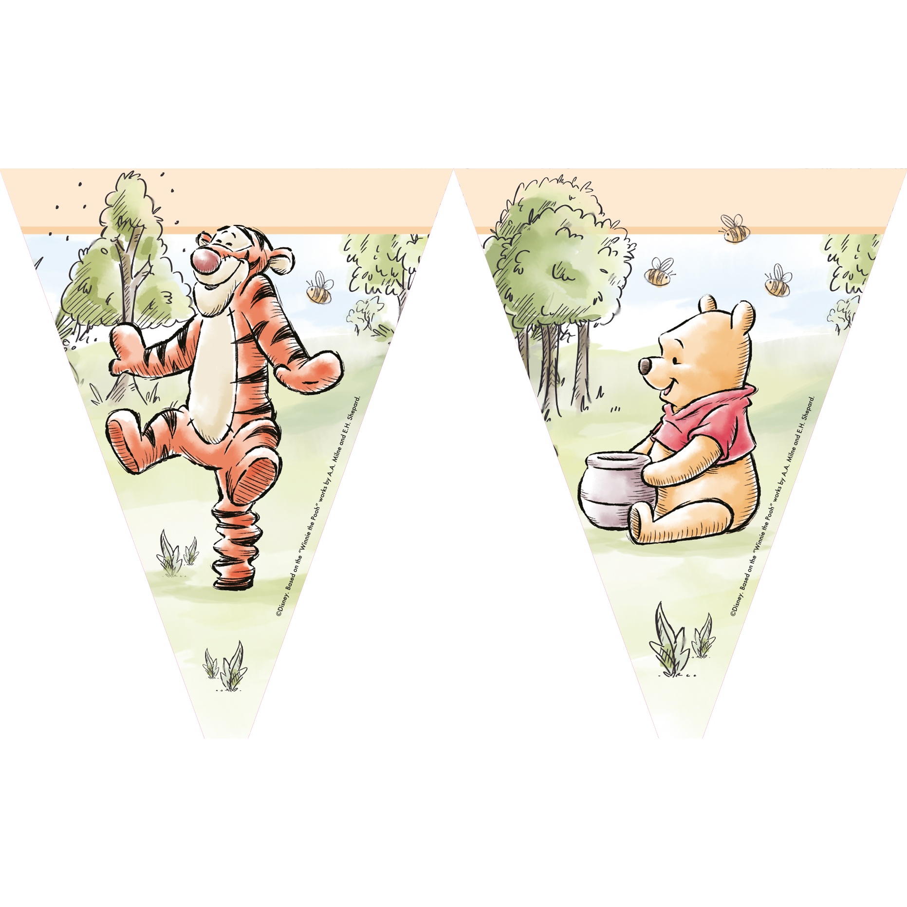 Bandeirola decorativa com ilustrações de Winnie the Pooh e Tigger em estilo natural, ideal para ambientar festas infantis.