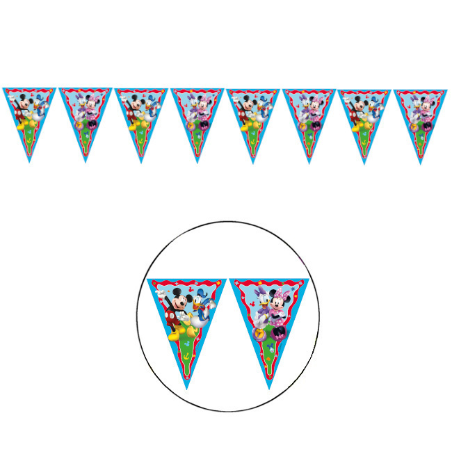 Um galhardete composto por 9 triângulos unidos por uma fita vermelha que pode ser pendurado no teto ou numa parede para decorar a sua festa.