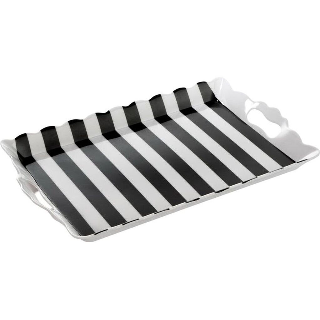 Bandeja de design clássico listrado em preto e branco que acrescenta um toque moderno e sofisticado a qualquer mesa. Seu formato compacto e as alças integradas tornam-na prática para apresentar aperitivos e decorar eventos. Ideal para combinar com louças de contraste e criar ambientes com estilo.