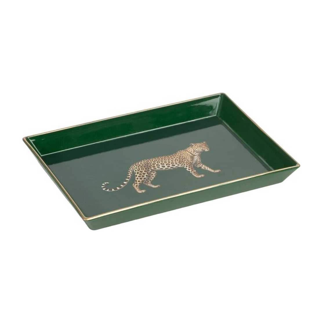 Elegante bandeja porta-trecos com design estilo luxury em tom verde profundo e detalhes dourados; um guepardo dourado no centro adiciona um toque sofisticado.