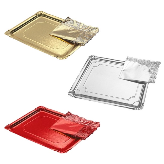Bandeja de 28 x 22 cm retangular de papelão em cores metalizadas com renda - 1 unidade