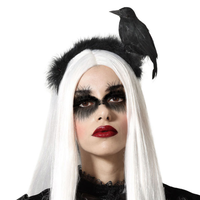 Bandolete com cabelo preto e a figura de um corvo preto. Acessório ideal para a noite de Halloween.