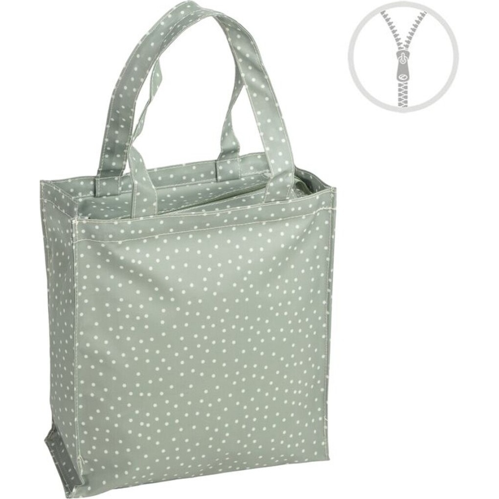 Bolsa com fecho de correr e estampa de bolinhas num suave tom de verde, concebida para que o senhor ou a senhora transporte os seus pertences com conforto e estilo.