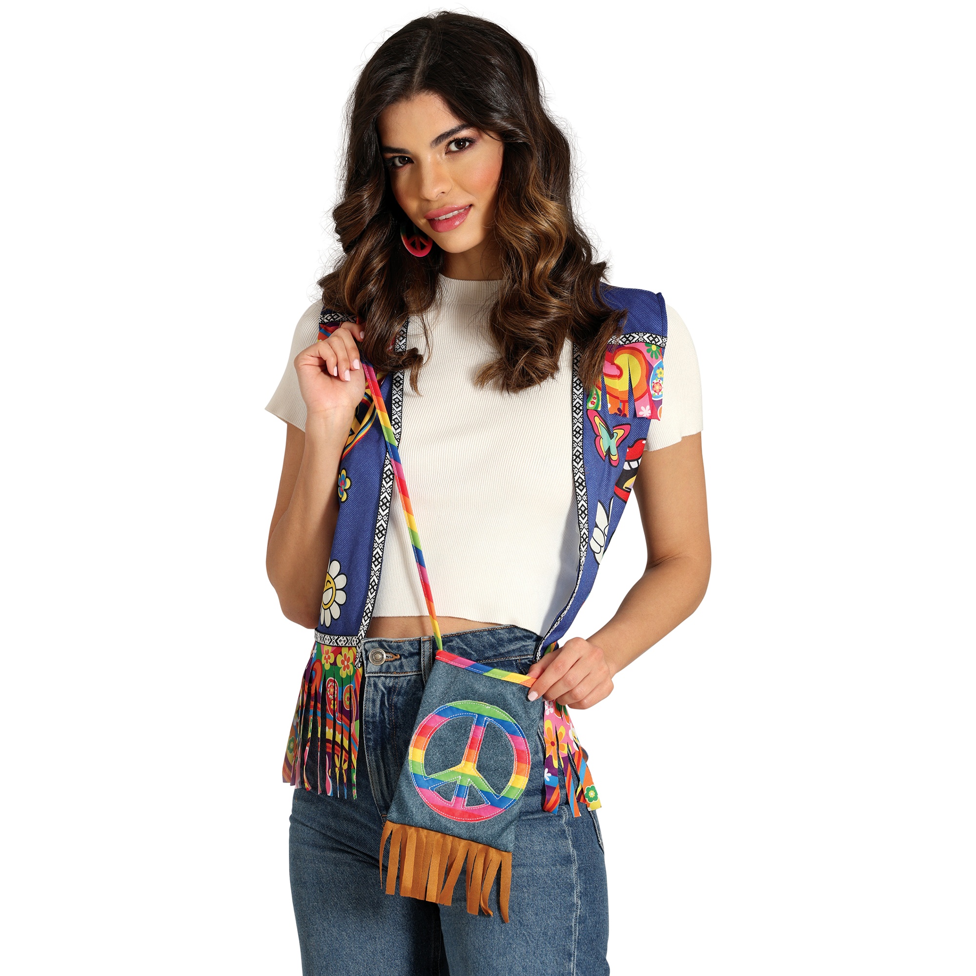Complemento ideal para looks hippie e fantasias. Bolsa tiracolo de estilo retro com aplicação do símbolo da paz em cores vivas e franjas na parte inferior. Confeccionada em poliéster resistente e de fácil limpeza. Tamanho compacto de 27 x 15 cm, perfeito para que o senhor/a senhora leve o essencial em festas, Carnaval ou festivais. Alça para usar ao ombro ou atravessada que oferece conforto e um toque boho a qualquer visual.