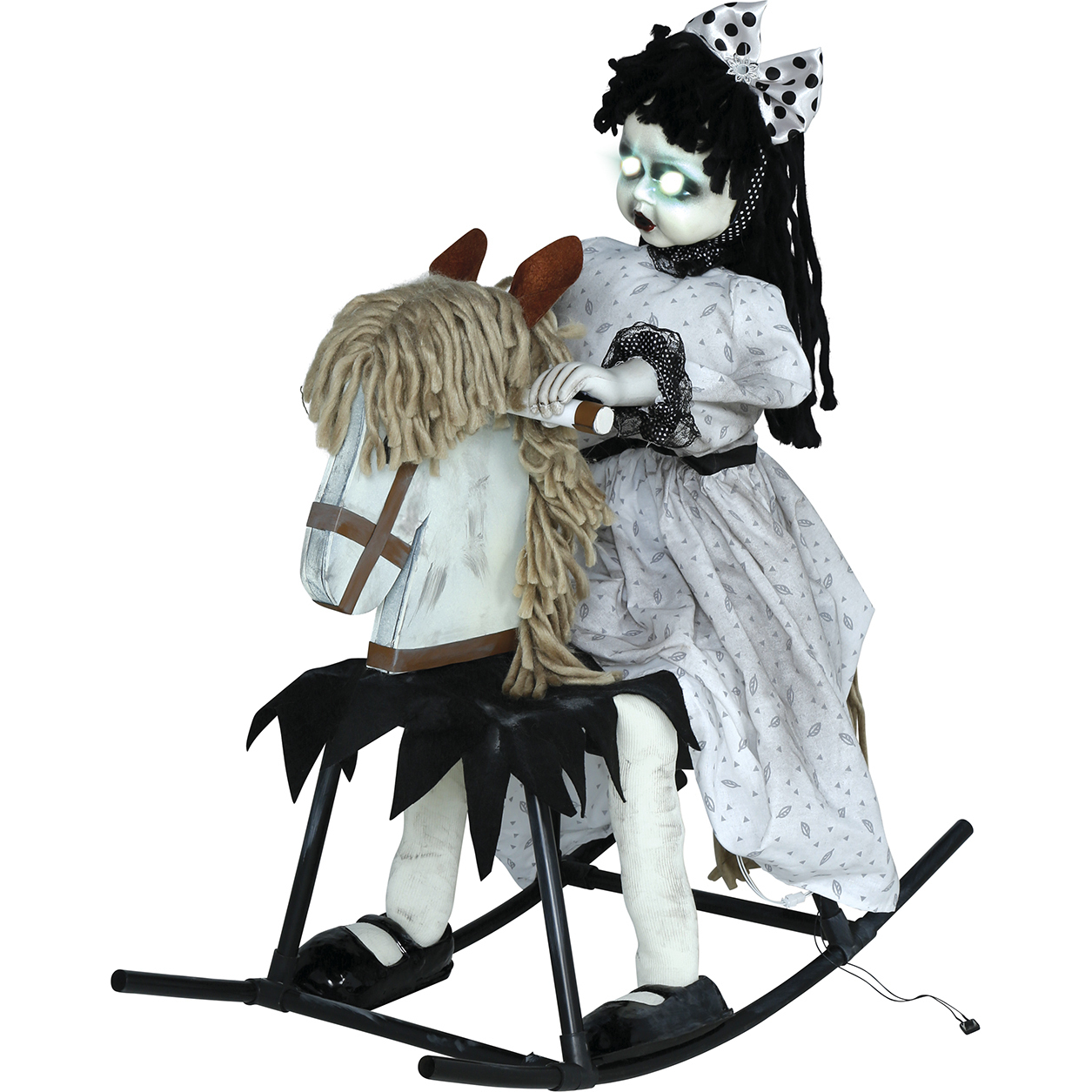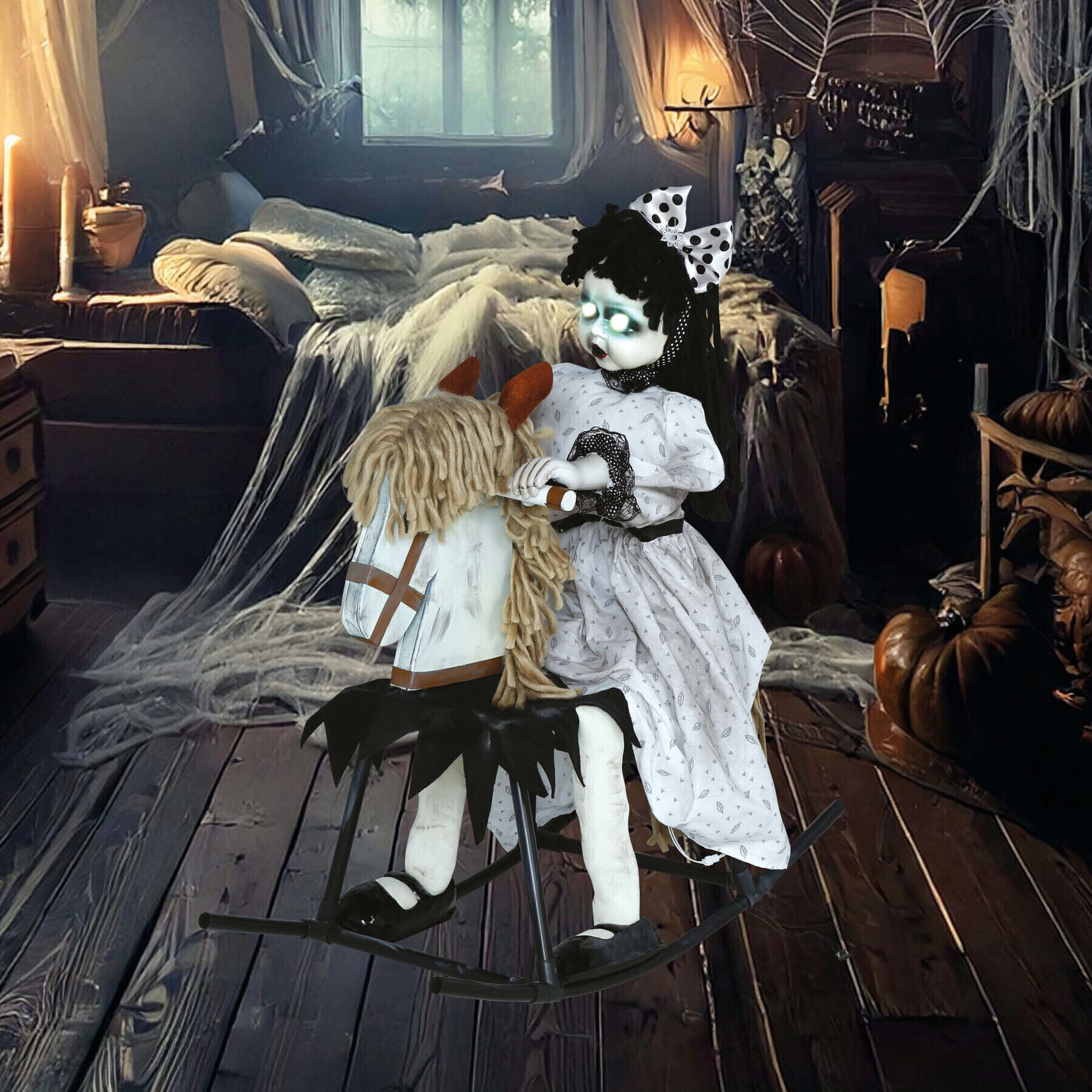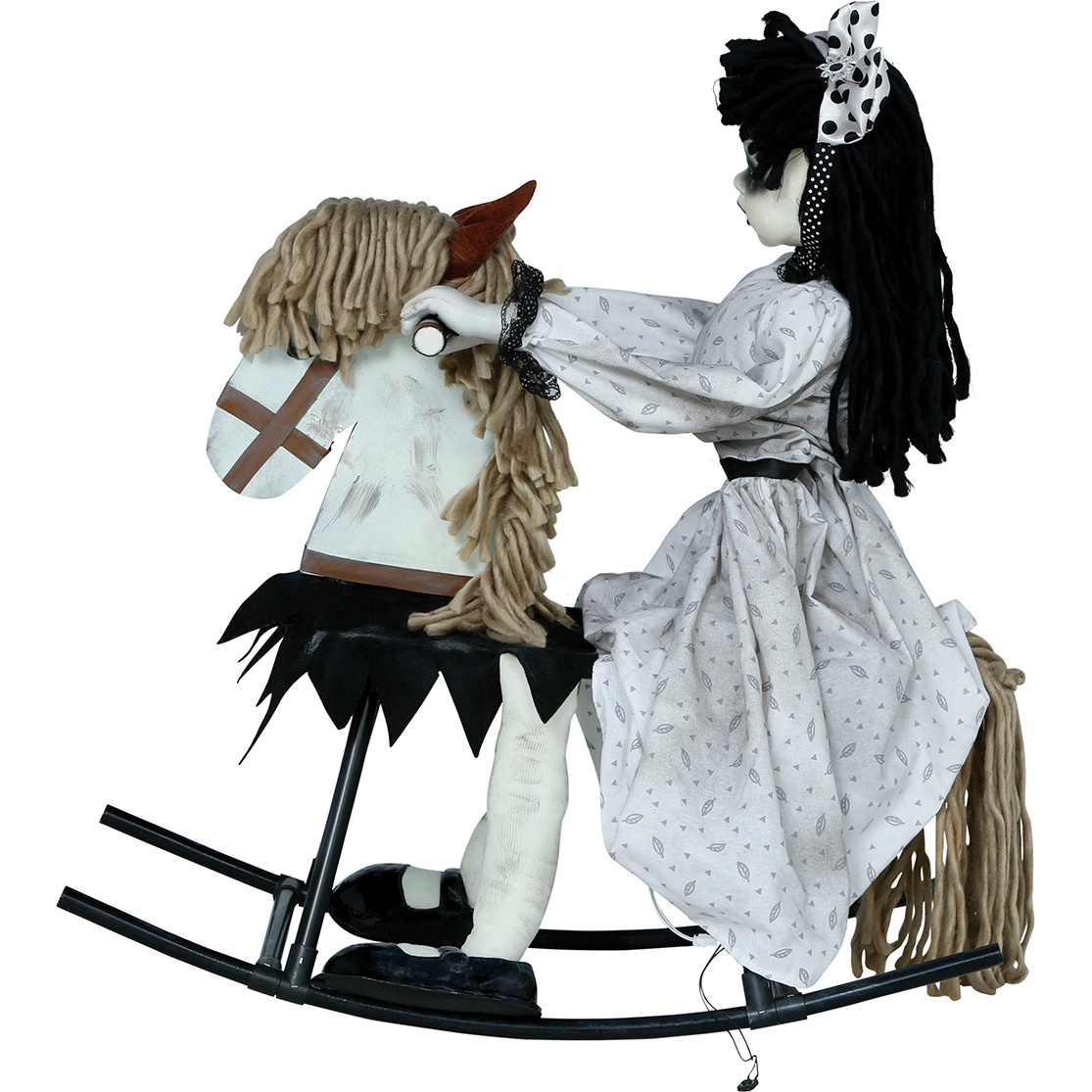 Boneca assustadora com cavalinho balanço com luz, som e movimento de 70 cm