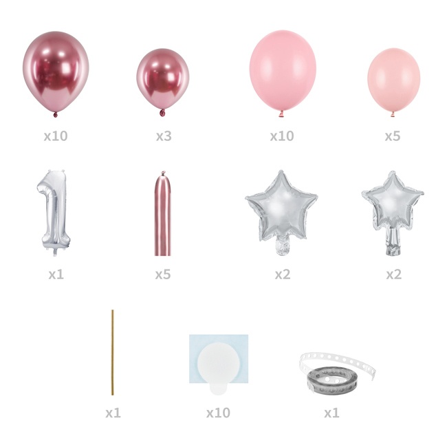 Bonito bouquet de balões para festas de primeiro aniversário em prateado e rosa metalizado. Será ideal para realçar a sua decoração de uma forma encantadora.