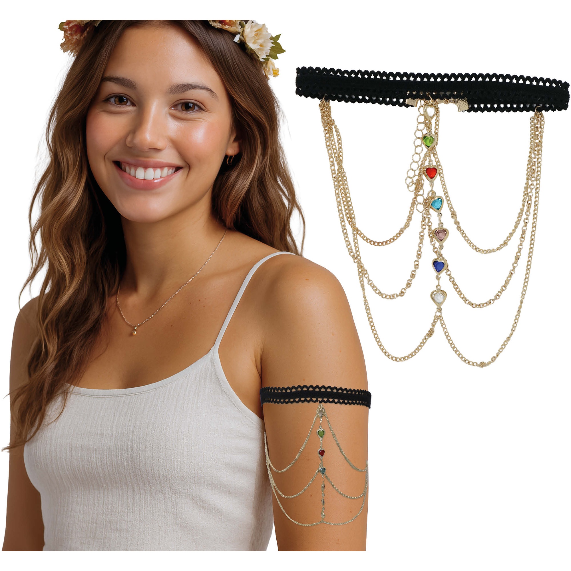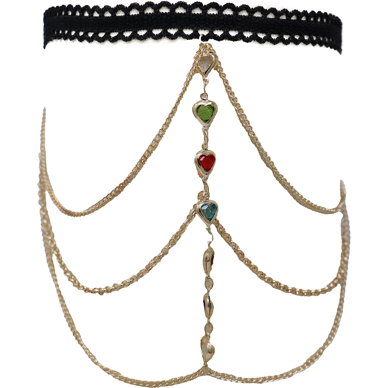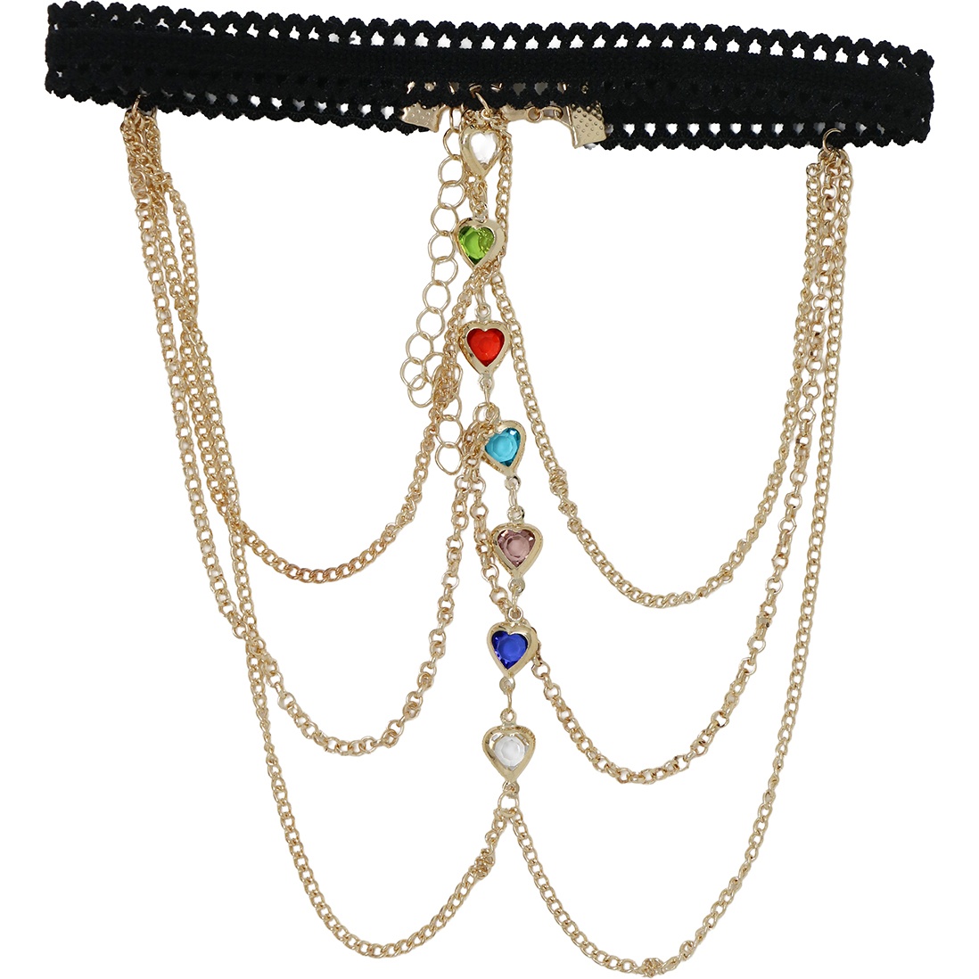 Possui uma faixa elástica em PVC e várias correntes douradas em camadas, decoradas com pequenas pedras coloridas que brilham com o movimento.