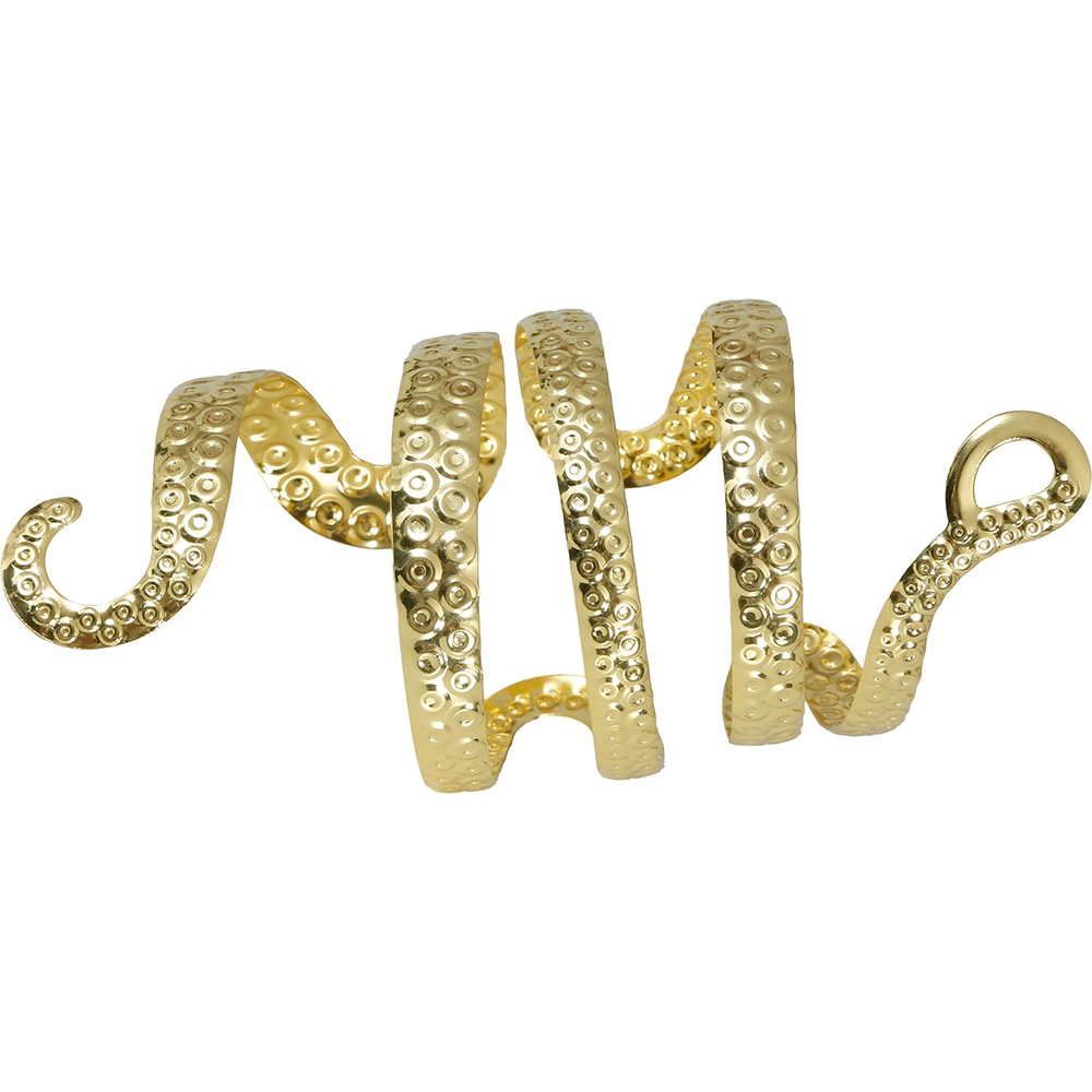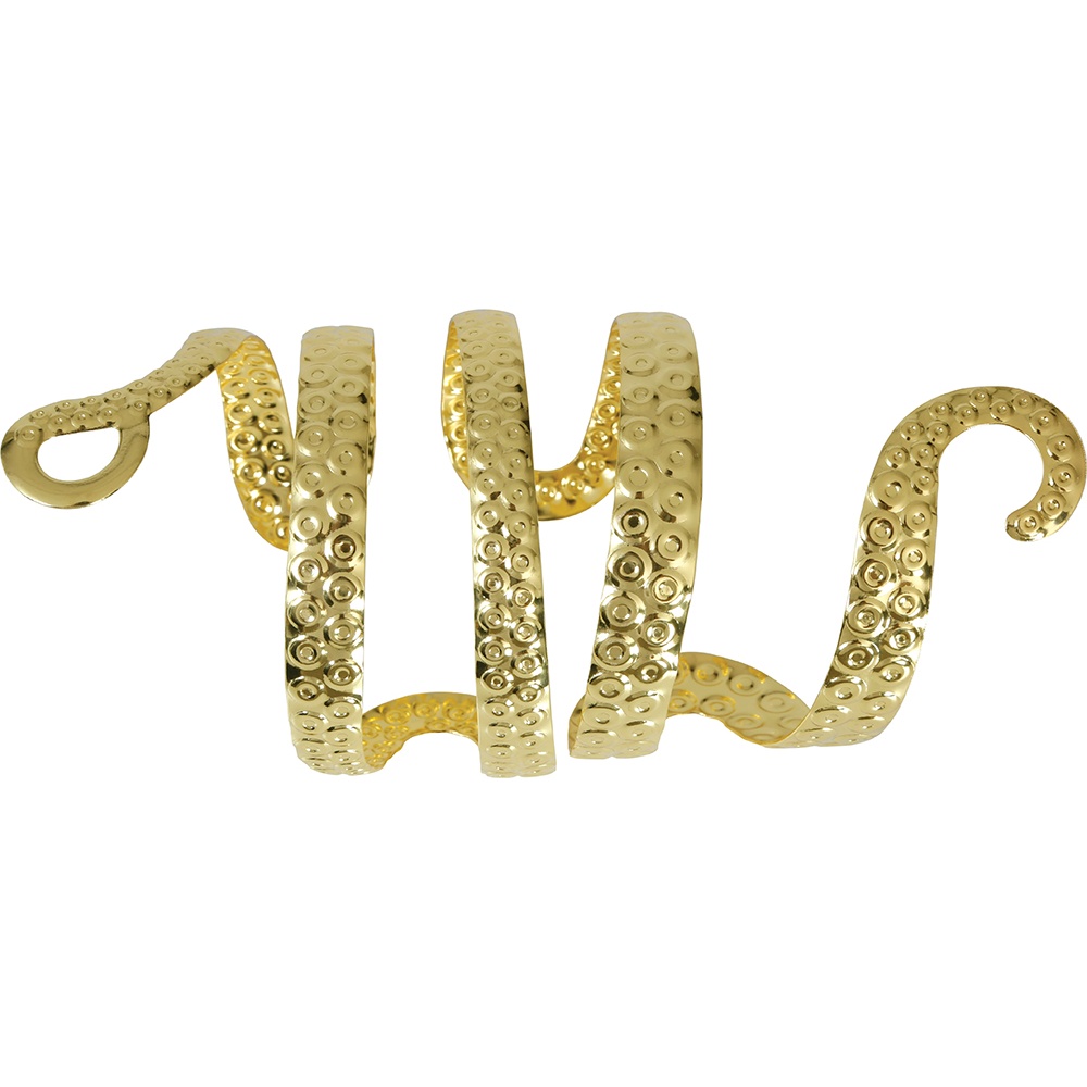 Elegante bracelete rígido com design em espiral que reproduz a silhueta de uma serpente, com detalhes texturizados. Sua estrutura metálica mantém a forma e enrola-se ao braço, oferecendo um ajuste de grande impacto visual. O acabamento dourado confere um aspecto clássico e ornamental que valoriza qualquer visual mitológico. Perfeito para cosplay, encenações teatrais e looks inspirados na Roma antiga.