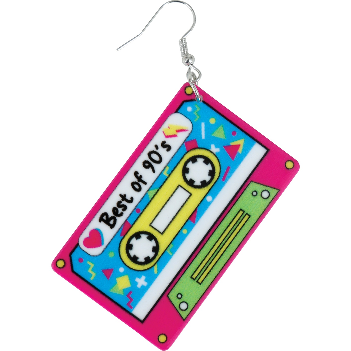 Brincos em forma de cassete inspirados na estética pop dos anos 90. As cores vibrantes e os detalhes reproduzem a aparência de uma fita cassete clássica, conferindo um toque vintage e divertido. Fabricados em metal e PVC, combinam resistência e leveza para garantir conforto mesmo após muitas horas de uso. Fecho de gancho prático e design marcante que valoriza o seu visual.