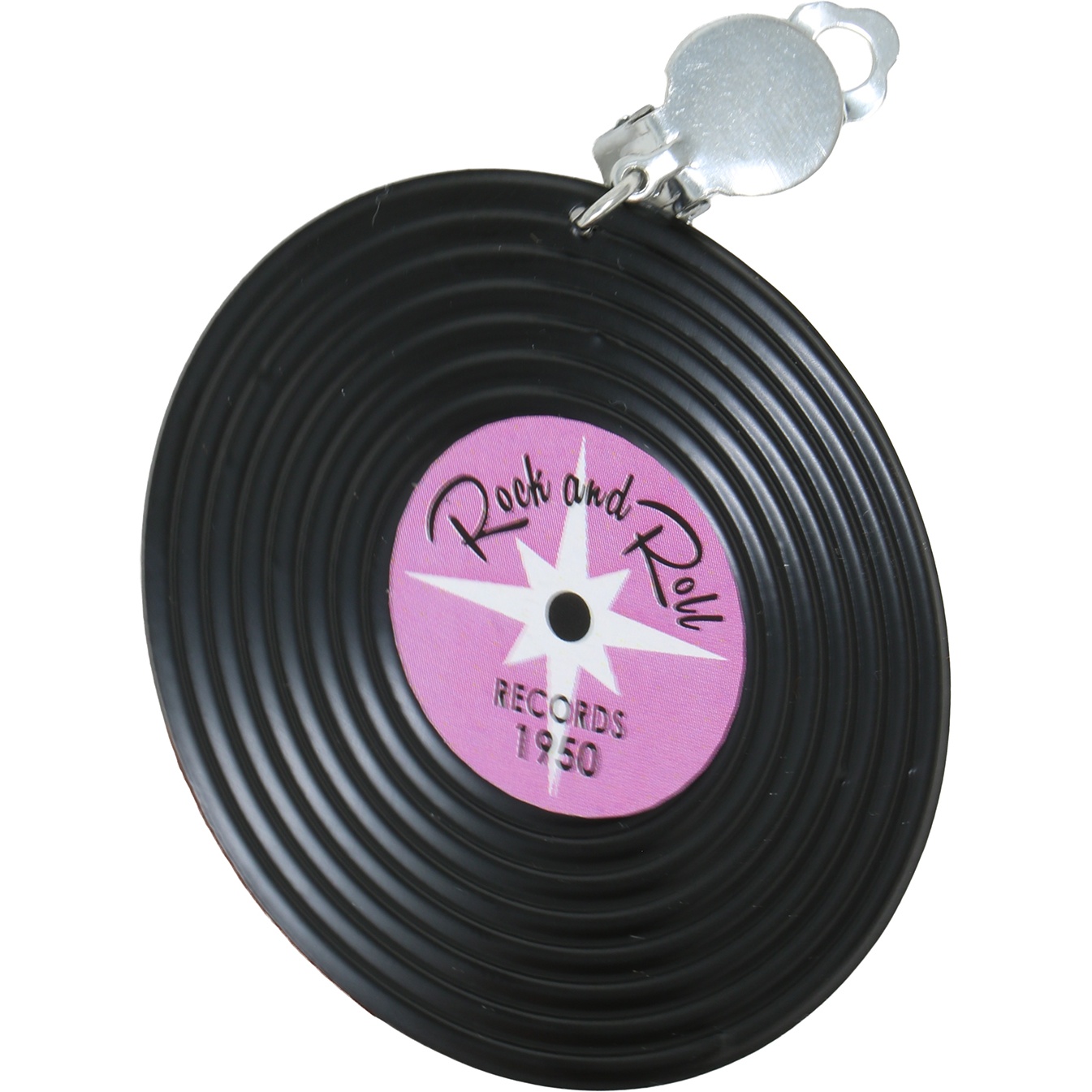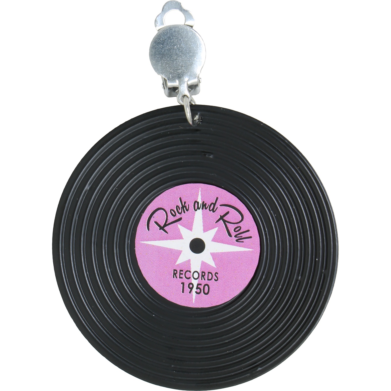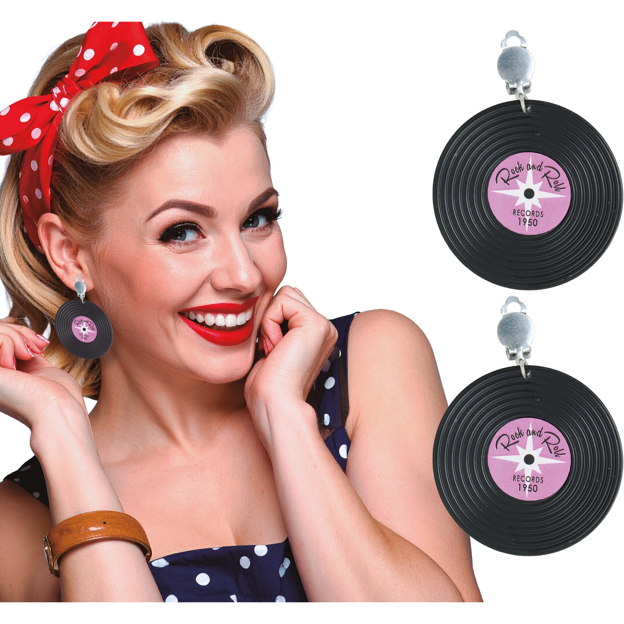 Brincos disco de vinil de 5 cm. Design retrô inspirado na estética pin-up e rockabilly dos anos 50. Leves e vistosos, conferem um toque vintage e divertido a qualquer visual. Fabricados em PVC com uma etiqueta central decorativa que recria a estética de um single clássico. O tamanho compacto torna-os visíveis sem serem pesados, como o senhor/a senhora pode ver na imagem.