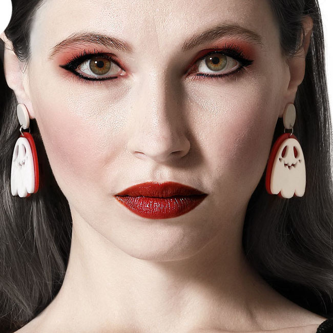 • Par de brincos em forma de fantasma em vermelho e branco. Divertidos e temáticos.